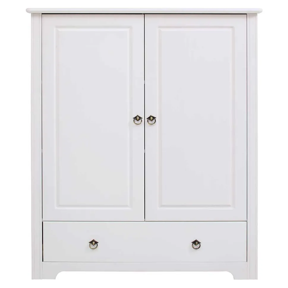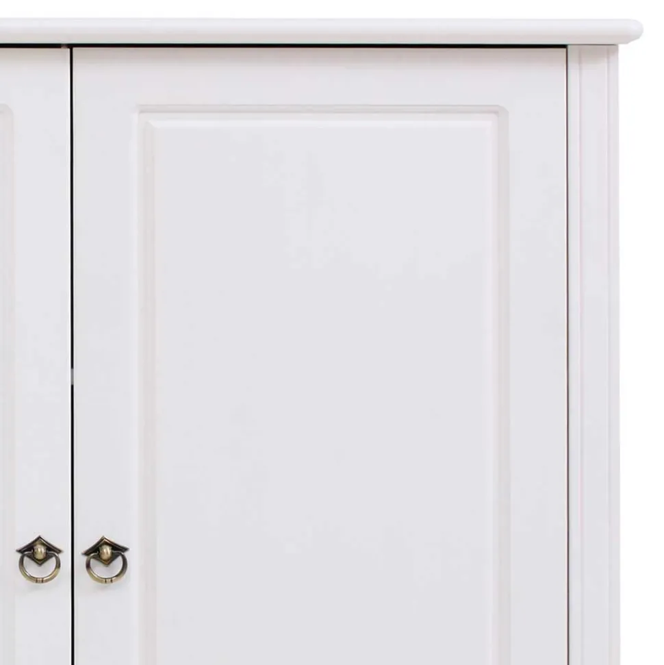 Mit den Maßen von 106 cm Breite, 126 cm Höhe und 38 cm Tiefe, bietet „Velriva“ nicht nur genügend Platz für Ihre Utensilien, sondern fügt sich als stilvolles Statement in jeden Raum ein. Die Türen, befestigt an langlebigen Metallscharnieren, bieten einfachen Zugang zum Innenraum. Darin sorgen zwei durchgehende, verstellbare Einlegeböden für Flexibilität. Der breite Schubkasten, elegant auf einem Metallauszug montiert, verspricht eine leichte Bedienung. Die dekorativen Metall-Ringgriffe setzen stilvolle Akzente und verleihen dem Möbelstück eine zusätzliche Eleganz.