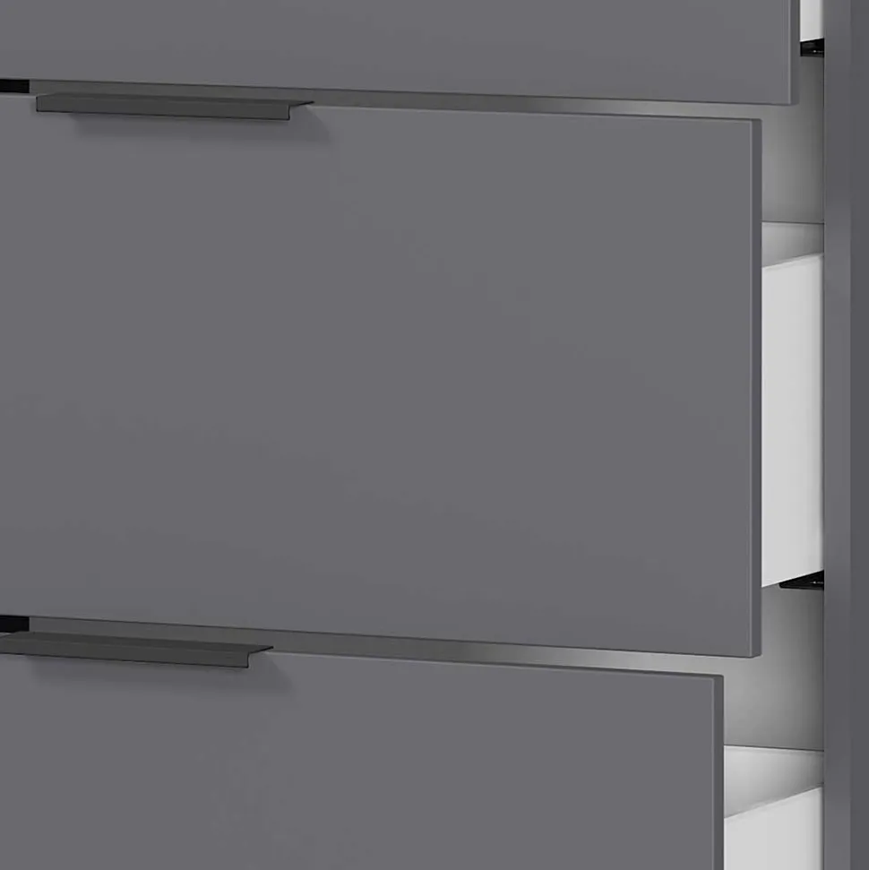 Das moderne, klare Design der „Lurys“ Kommode passt sich nahtlos in jedes Wohnkonzept ein. Mit einer filigranen 8 mm Deckplatte in Wildeiche-Holzoptik wird ein schöner Kontrast zur dunkelgrauen Oberfläche geschaffen, der Wärme und Eleganz in Ihr Zuhause bringt. Die dezenten Metall-Kantengriffe unterstreichen die elegante Formsprache und sorgen für eine leichte Bedienung.