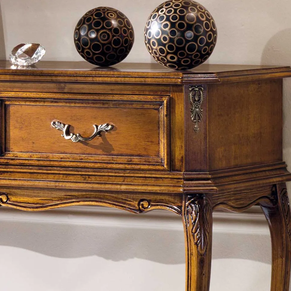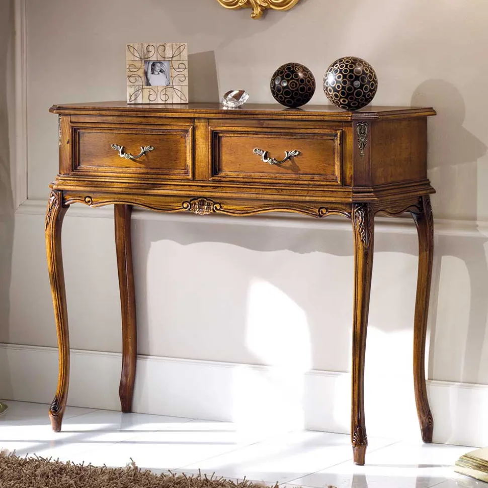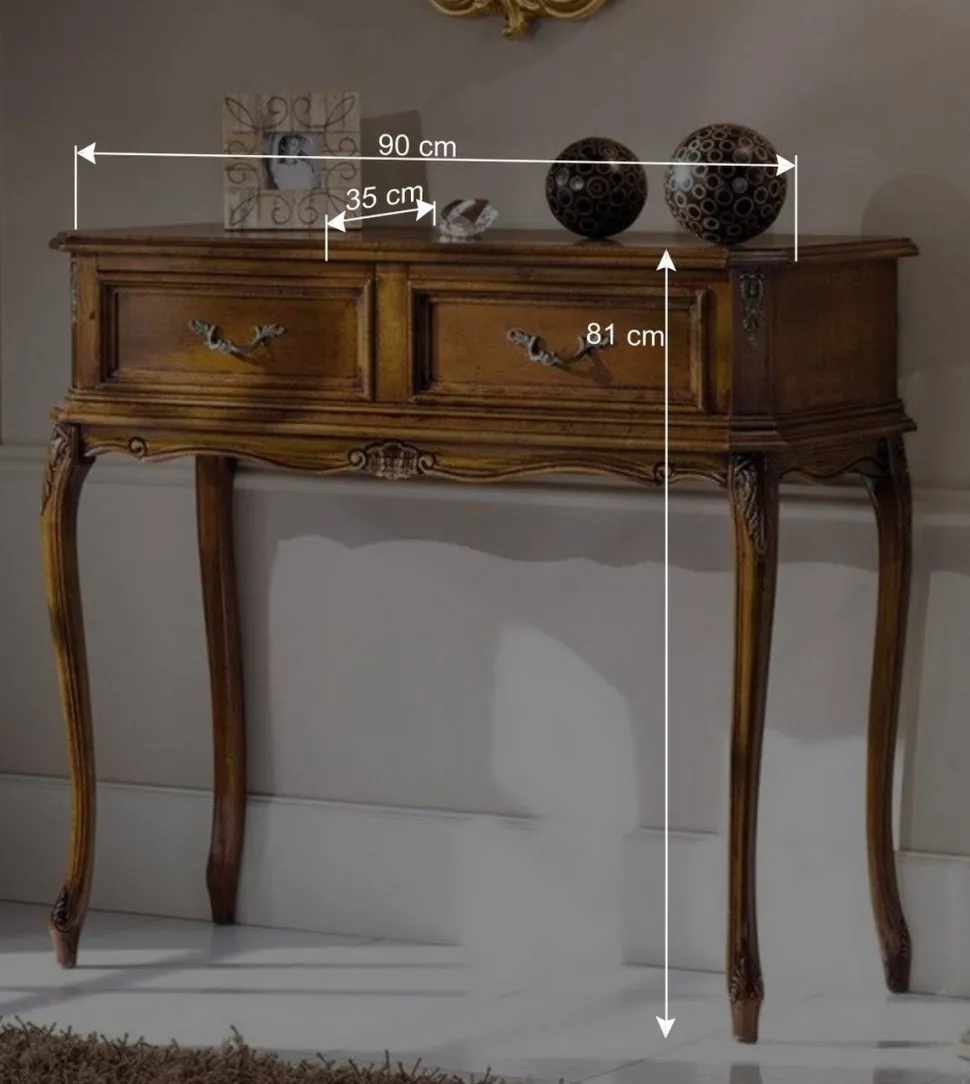 Dieser Konsolentisch besticht durch seine Liebe zum Detail, wie die handgearbeiteten Intarsienarbeiten aus Pappelholz zeigen. Mit einer Breite von 90 cm, einer Höhe von 81 cm und einer Tiefe von 35 cm, bietet der Tisch trotz seiner kompakten Größe viel Platz. Die schwungvolle Linienführung und die leicht überstehende, attraktiv formgefräste Tischplatte, spielen mit dem Charme vergangener Zeiten. Unter der Tischplatte befinden sich zwei Schubladen mit Holzauszug und dekorativer Kassettenfront, ergänzt durch stilvolle Metall-Bügelgriffe.