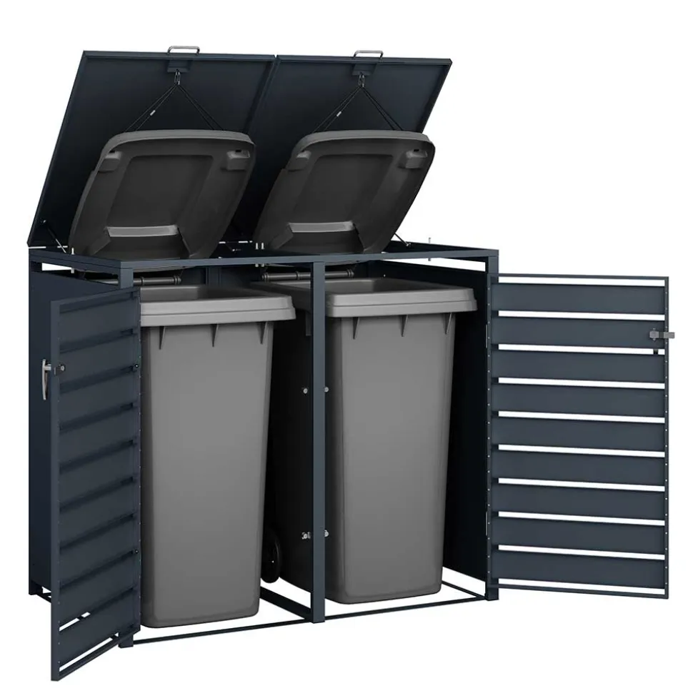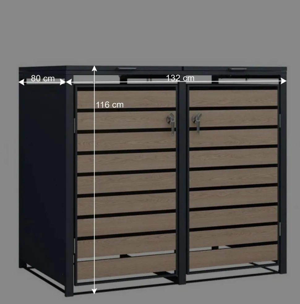 Mit einer Breite von 132 cm, einer Höhe von 116 cm und einer Tiefe von 80 cm bietet die Mülltonnenbox „Rodicca“ ausreichend Platz für zwei kleine 120 Liter Tonnen oder große 240 Liter Tonnen – die Standardgröße für die meisten Haushalte. Diese großzügigen Abmessungen gewährleisten, dass Ihre Mülltonnen sicher und ordentlich verstaut sind, ohne dass der Zugang zu ihnen beeinträchtigt wird. Das spart nicht nur Platz, sondern trägt auch zu einer aufgeräumten und ansprechenden Gartenumgebung bei.