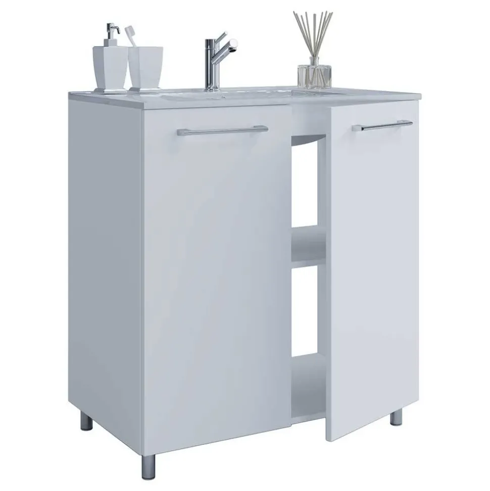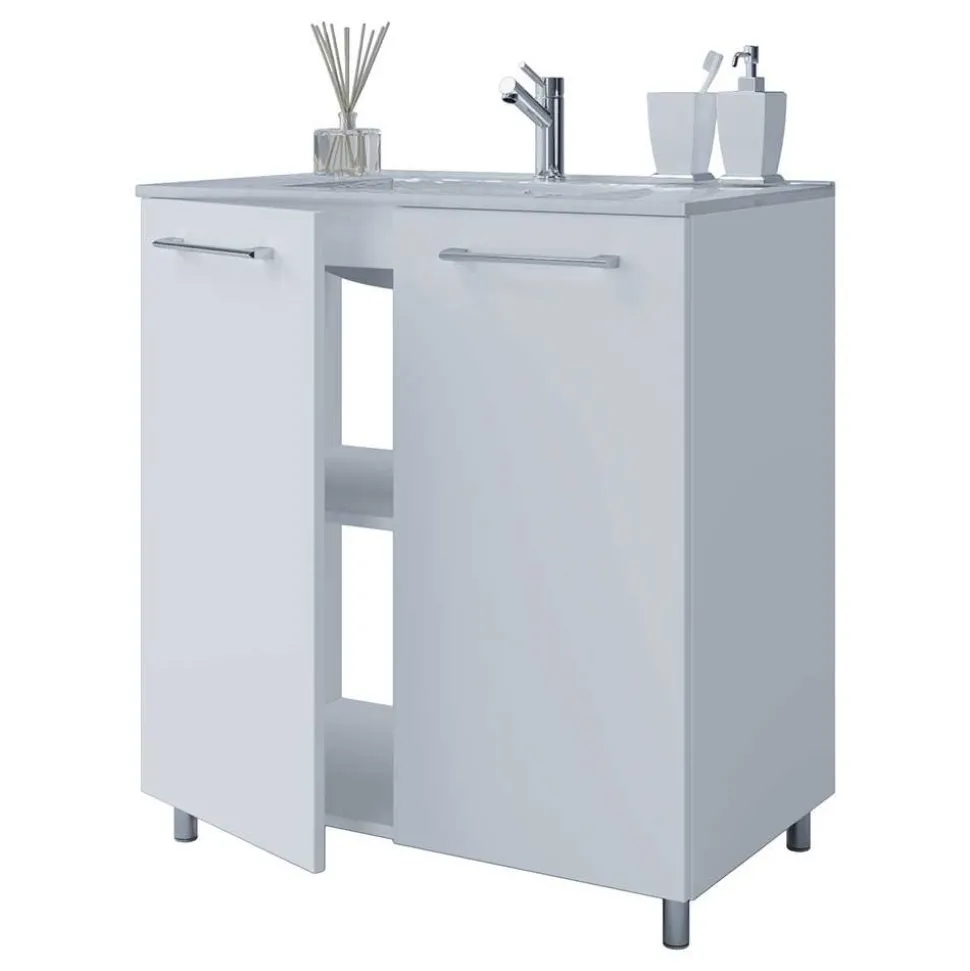 - Inklusive Keramik-Waschbecken mit seitlichen Ablagen