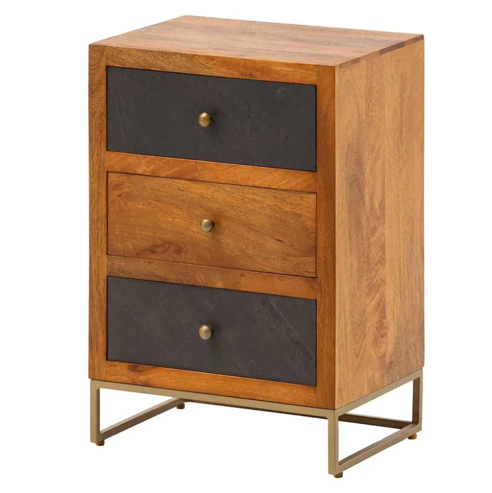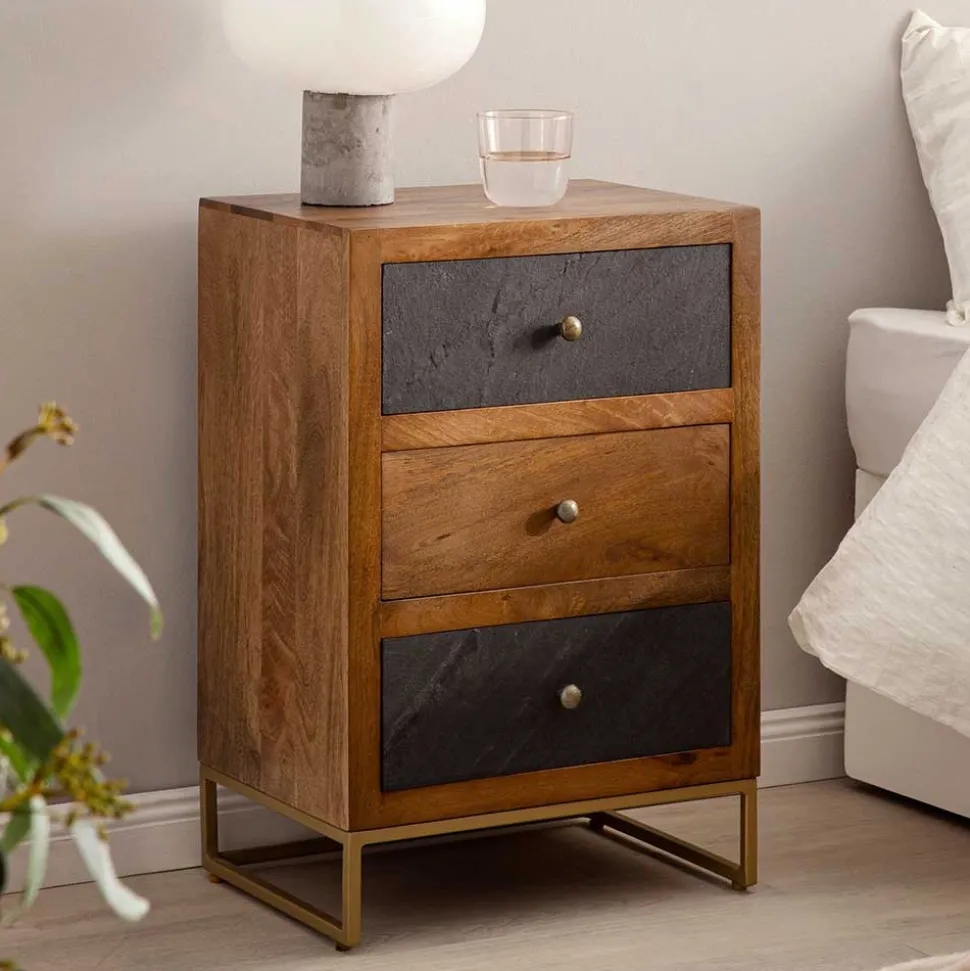 Verleihen Sie Ihrem Schlafzimmer einen Hauch von Luxus und Funktionalität mit der 3-Schubladen-Nachtkommode „Posto“. Dieses moderne Möbelstück besticht durch sein geradliniges Design und seine exquisite Farbgebung in Anthrazit, Mango Natur und Gold. Die Kombination aus hochwertigen Materialien und präziser Verarbeitung macht die Nachtkommode zu einem echten Highlight in Ihrem Schlafzimmer.