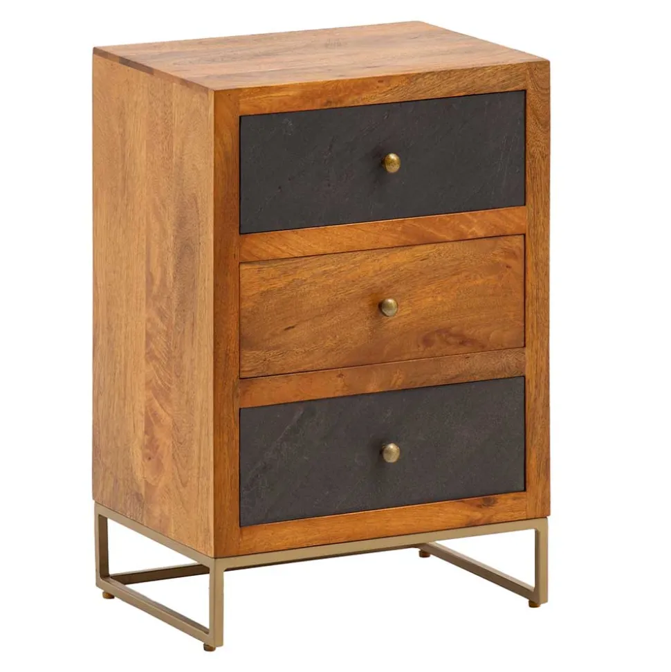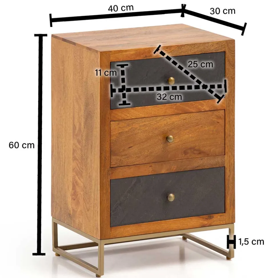 Die drei großzügigen Schubladen bieten Ihnen reichlich Stauraum und sind durch einen Drehstopper vollständig herausnehmbar. Zwei der Schubladenfronten sind in einer beeindruckenden 3D-Steinoptik in Anthrazit gestaltet, während die dritte Front wie der Korpus aus Mangoholz besteht. Die Innenmaße der Schubladen betragen BxHxT: 32x11x25 cm. Mit einer Materialstärke von ca. 1 cm Holz und 1,5 cm Metall ist die Nachtkommode sowohl stabil als auch belastbar. Die Deckplatte kann bis zu 10 kg und jede Schublade bis zu 5 kg tragen.