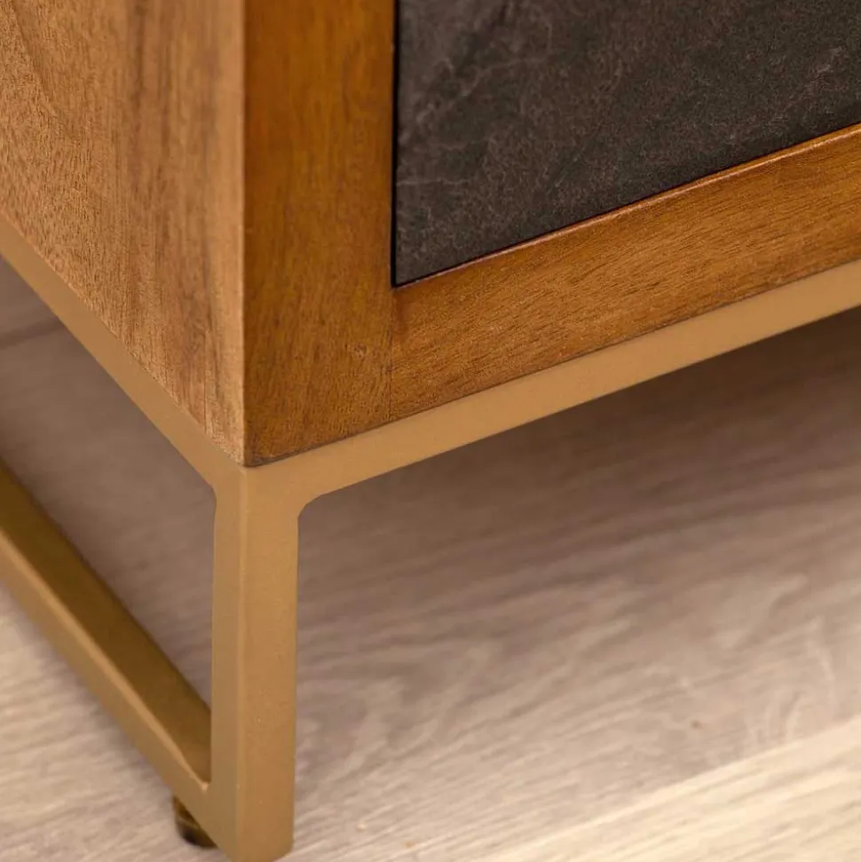 Die Nachtkommode „Posto“ wird aus massivem Mangobaumholz, robustem MDF und edlem Metall gefertigt. Die lackierte Holzoberfläche ist nicht nur optisch ansprechend, sondern auch besonders pflegeleicht. Runde Metallgriffe in Gold setzen stilvolle Akzente und harmonieren perfekt mit dem markanten Bügelgestell aus Metall, das in glänzendem Gold pulverbeschichtet ist. Dieses stabile Gestell sorgt für einen sicheren Stand und verleiht dem Nachtschrank seinen besonderen Charme.