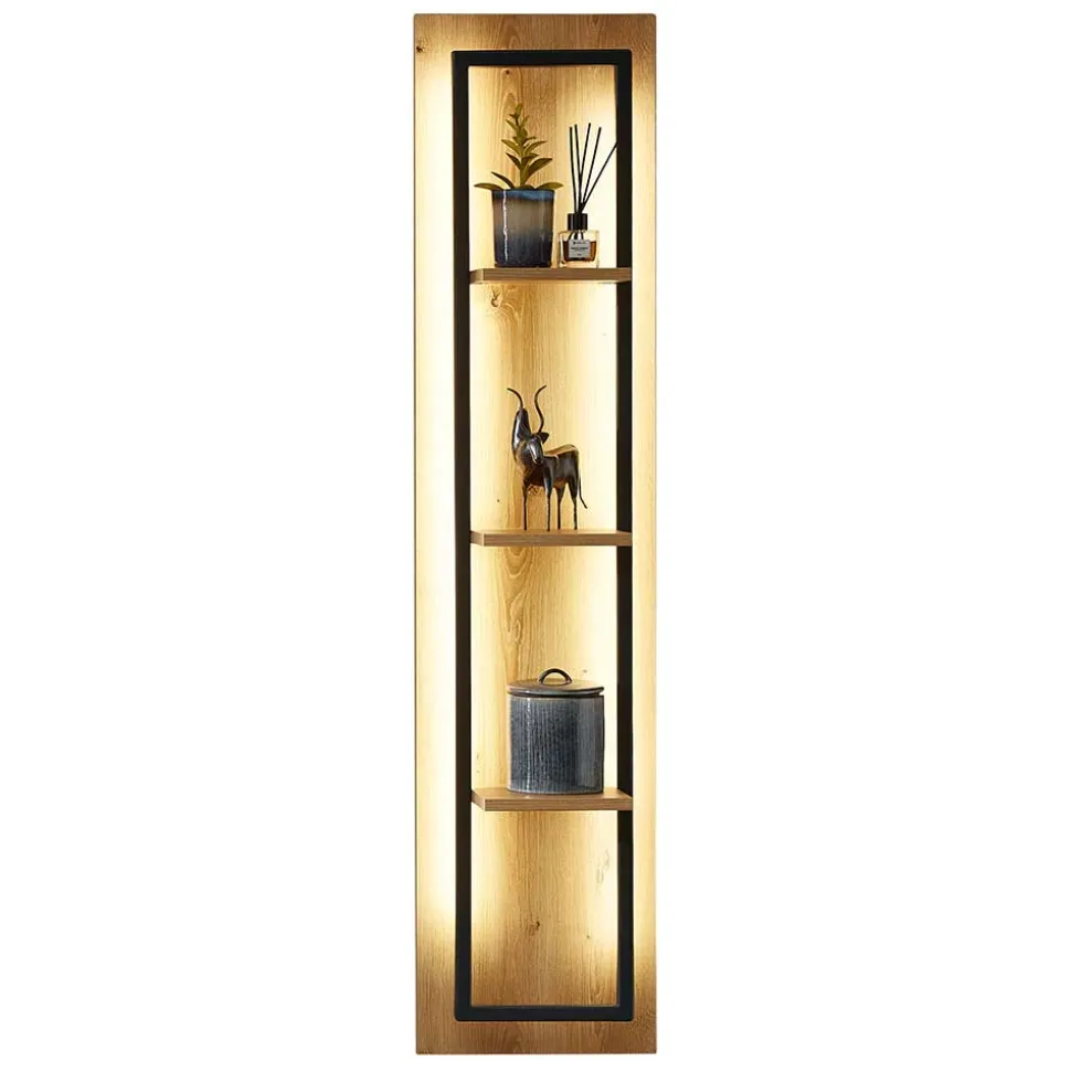 Das Wandregal „Elprisca“ bietet mit seinen drei Böden ausreichend Platz für Ihre Lieblingsbücher, Dekorationsgegenstände oder auch wichtige Alltagsgegenstände, die Sie stilvoll präsentieren möchten. Die Maße von 30 cm Breite, 130 cm Höhe und 18 cm Tiefe sind ideal, um in jedem Raum effizient genutzt zu werden, ohne dabei aufdringlich zu wirken. Die integrierte, sparsame LED-Beleuchtung setzt Ihre Ausstellungsstücke ins rechte Licht und schafft eine angenehme Atmosphäre.