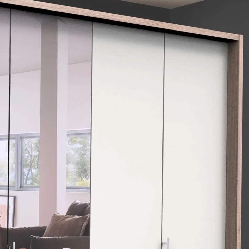 Einen besonderen Blickfang stellen die zwei Spiegelelemente in Parsol-Bronze an den beiden mittigen Türfronten dar. Sie verleihen dem Schrank nicht nur eine besondere Ästhetik, sondern bieten auch praktische Vorteile. Die Spiegel vergrößern optisch den Raum und ermöglichen Ihnen, Ihr Outfit direkt am Schrank zu überprüfen.