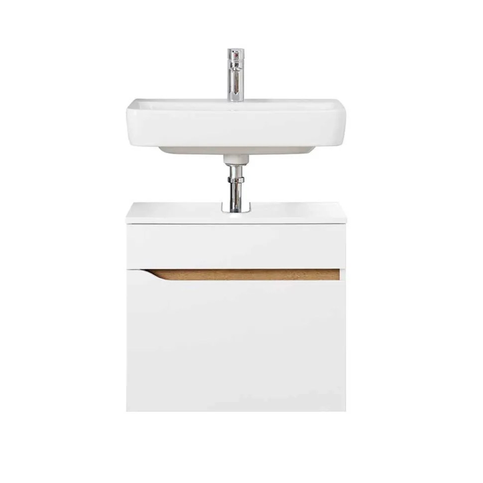 - Praktischer Waschbeckenunterschrank in Weiß und Eichefarben