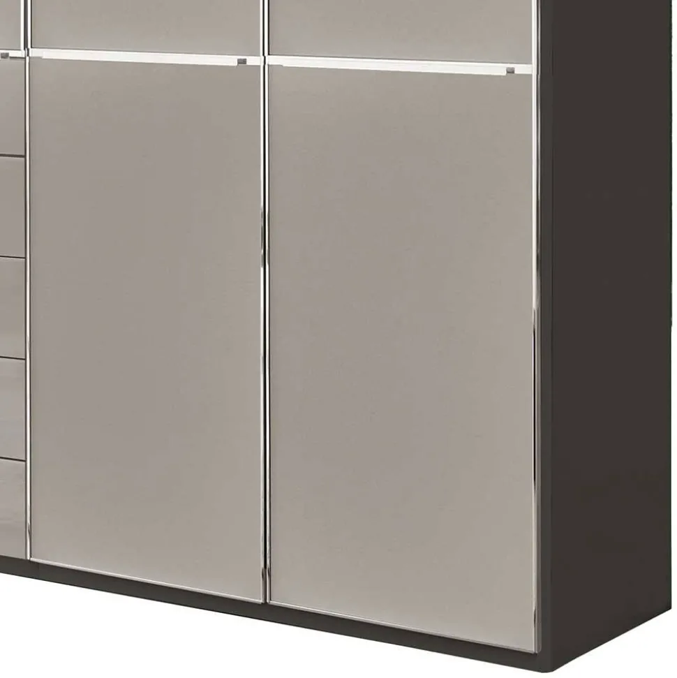 Der „Korcula“ zeichnet sich durch seine stabile Konstruktion aus Spanplatte und die pflegeleichten Glasfronten aus. Die stilvollen Metall-Kantengriffe in Chrom und die eleganten Griffleisten an den Türen betonen den modernen Charme des Schranks. Das solide Sockelgestell sorgt für sicheren Stand, während das elegante Silber-Grau Streifenmuster im Inneren sowohl optisch ansprechend als auch strapazierfähig ist.