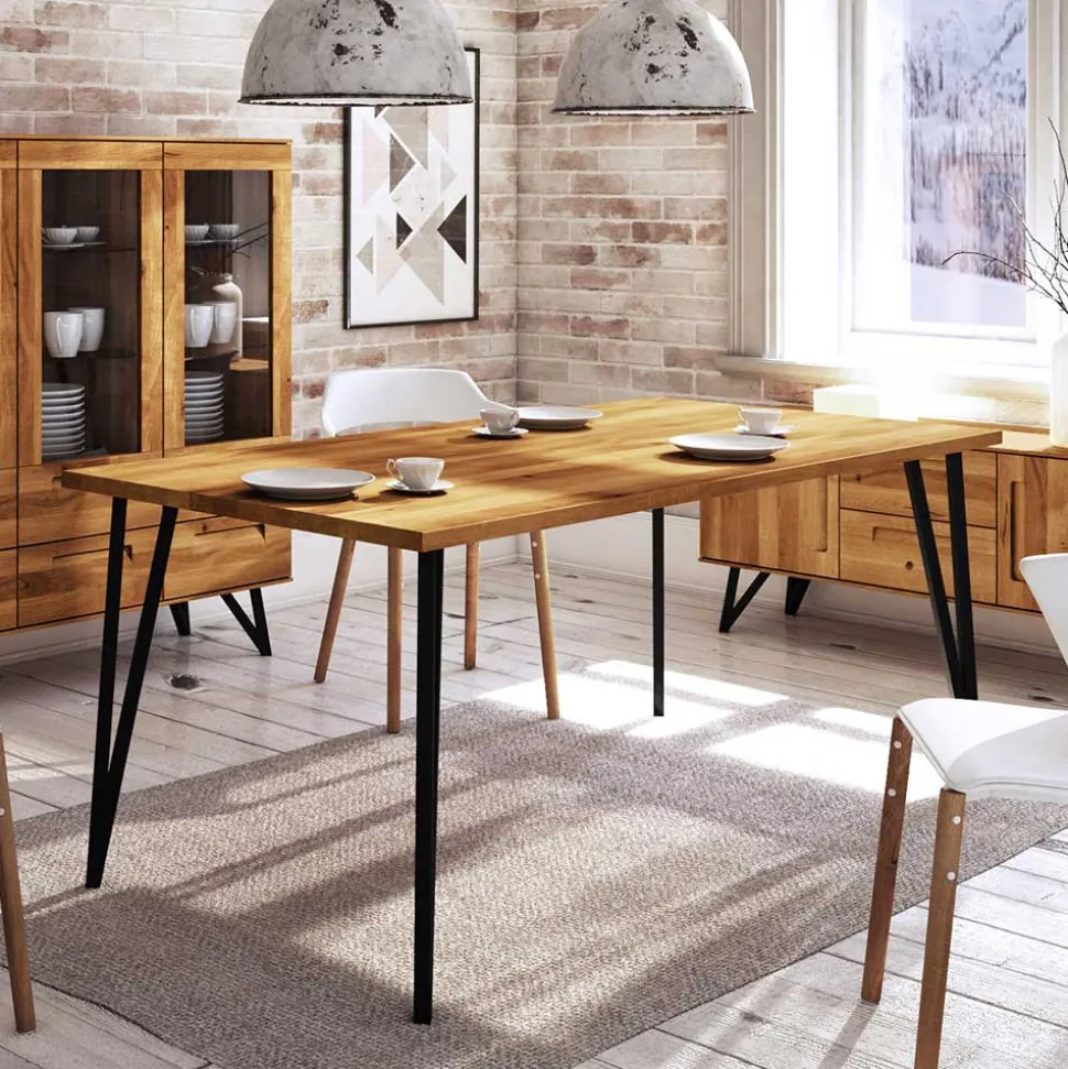 Gefertigt aus massiver Wildeiche, bringt dieser Tisch nicht nur Langlebigkeit, sondern auch eine unverwechselbare Ästhetik ins Haus. Wildeiche ist bekannt für ihre beeindruckende Festigkeit und ihre warme, goldbraune Farbgebung. Zudem betont die lebhafte Maserung die Einzigartigkeit jedes einzelnen Möbelstücks – Ihr Tisch ist wahrlich ein Unikat.