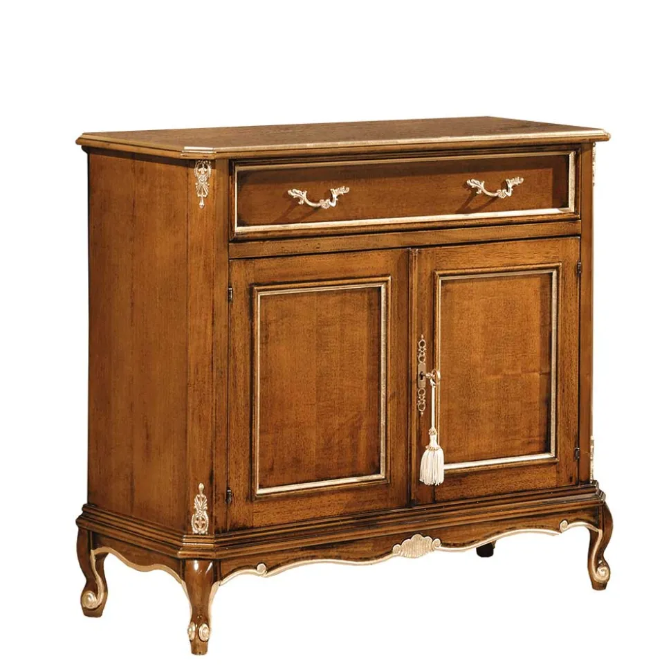 Zur Fertigung der Kommode Carlenna werden verschiedene Massivhölzer und der Holzwerkstoff MDF verwendet. So besteht die Schublade aus Pappel, die Türen bestehen aus Tulpenbaum und das aufwändig beschnitzte Gestell mit den vier Füßen besteht aus Buche. Die Seitenteile und die Deckplatte sind aus MDF hergestellt. Die Holzoberflächen sind in Nussbaumfarben lackiert, während die MDF Platte mit Nussbaum furniert und lackiert ist. Als Kontrast zum dunklen Braun des Nussbaums sind dekorative Akzente in Gold auf dem Möbelstück zu finden. Beschläge und Bügelgriffe der Kommode sind aus Metall.