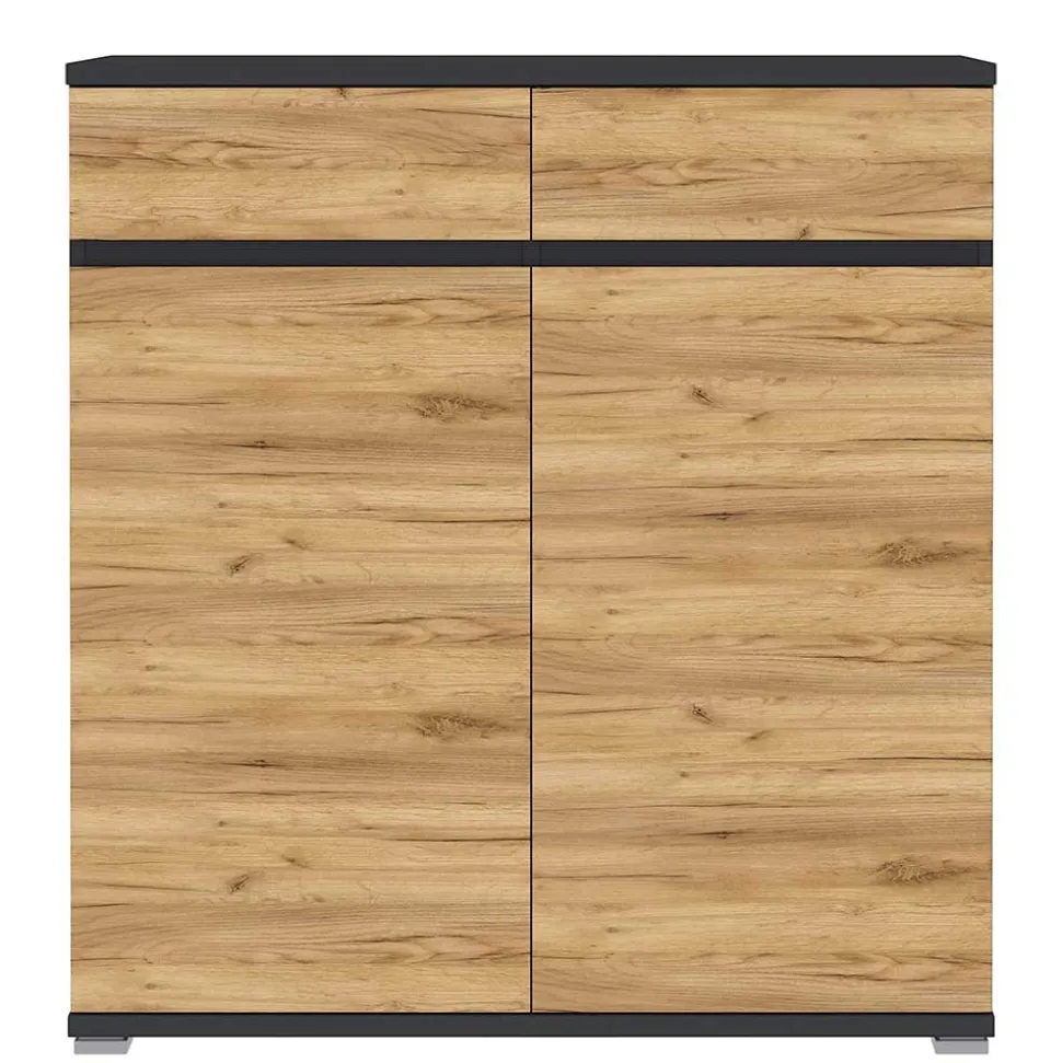 Qualität aus deutscher Herstellung ist hier deutlich spürbar. Vollständig aus robuster Spanplatte gefertigt, punktet Orsecca mit Stabilität und einer umweltfreundlichen Herstellung. Spanplatten bestehen aus recycelten Holzspänen, die unter hohem Druck zu widerstandsfähigen Platten gepresst werden. Das spart Ressourcen, bietet eine hohe Formstabilität und ermöglicht gleichzeitig ein attraktives Preis-Leistungs-Verhältnis. Die pflegeleichten Oberflächen sind foliert in realistischer Wildeiche-Holzoptik und Anthrazit. Bei diesem Folierungsverfahren wird eine strapazierfähige Dekorschicht auf die Platte laminiert, wodurch ein täuschend echtes Holzbild entsteht, das leicht zu reinigen und resistent gegen Alltagsbeanspruchungen ist. Stoßfeste ABS-Kanten schützen das Möbelstück vor Absplitterungen und garantieren eine lange Lebensdauer – perfekt für den täglichen Einsatz.