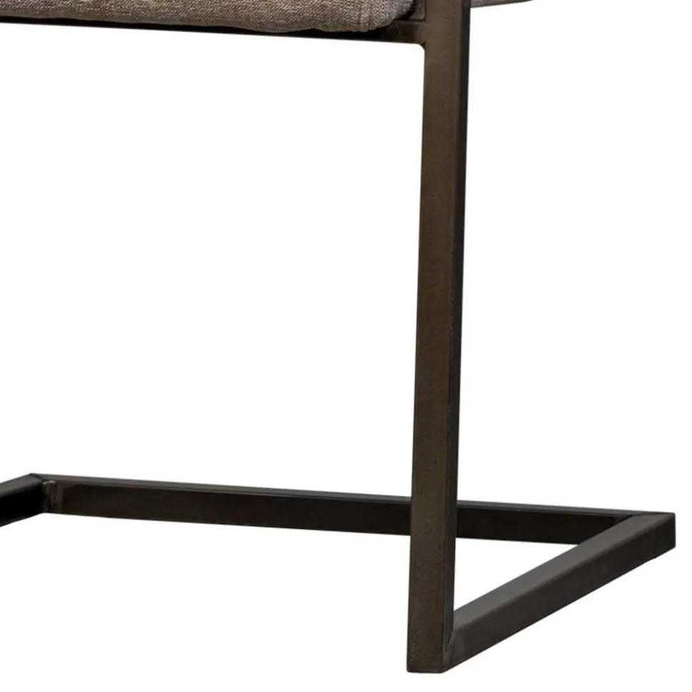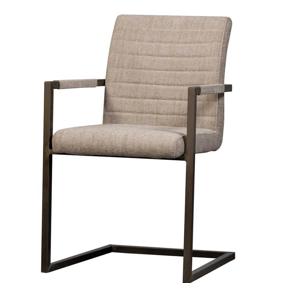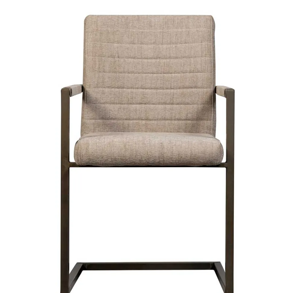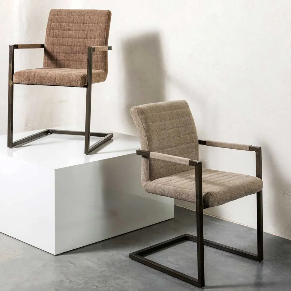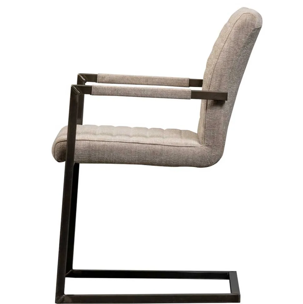 Gefertigt aus robusten und pflegeleichten Materialien, bietet der „Sentata“ eine hohe Alltagstauglichkeit. Der Bezug aus strapazierfähigem Webstoff (100 % Polyester) begeistert mit seiner dezenten Struktur und ist gleichzeitig widerstandsfähig gegen Abnutzung. Die Armlehnen bestehen aus kantigem Metall mit einer Breite von etwa 2,5 cm und sind teilweise bezogen – eine gelungene Kombination aus Komfort und markantem Design. Das Gestell aus schwarz pulverbeschichtetem Metall unterstreicht den industriellen Charakter des Stuhls und sorgt für Stabilität.