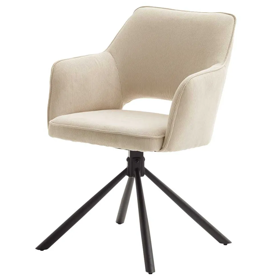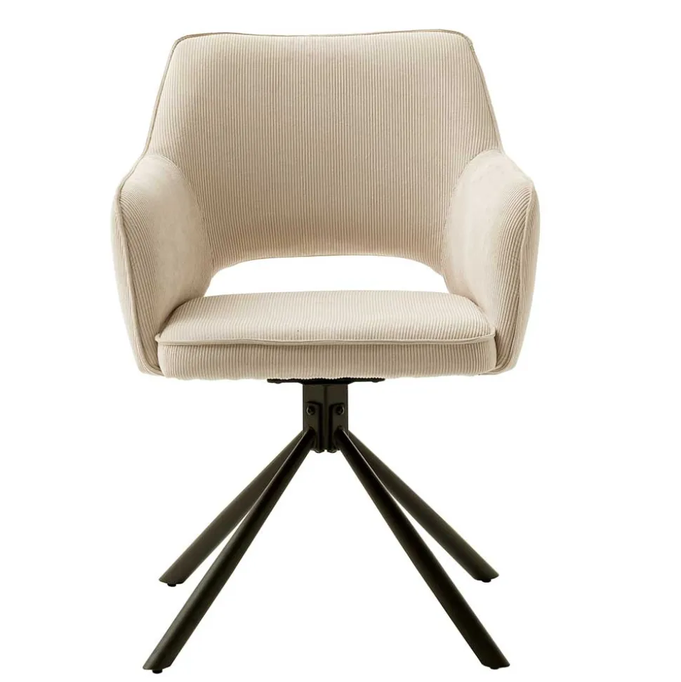 Der Bezug aus strapazierfähigem Cord (100% Polyester) und die komfortable Polsterung aus Schaumstoff machen den „Makimona“ zu einem bequemen Sitzmöbel. Die sachte ausgestellten Armlehnen und die leicht nach hinten geneigte Rückenlehne sorgen für zusätzlichen Komfort und eine harmonische Optik. Das stabile Stativ-Gestell aus robustem Metall in elegantem Mattschwarz verleiht dem Stuhl die nötige Stabilität.