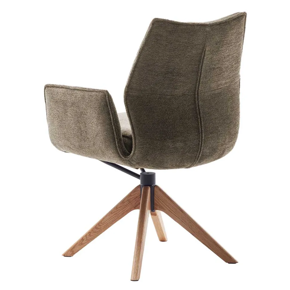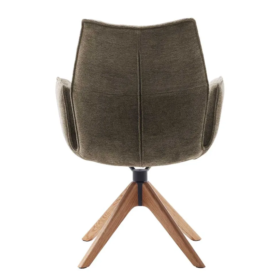 Der Armlehnenstuhl „Joycelina“ verbindet wohnliches Design mit exzellentem Sitzkomfort. Der strukturierte Chenillegewebe-Bezug in Braun sorgt für eine einladende Optik, während das lackierte Eiche-Massivholzgestell mit Schwingfunktion eine natürliche Wärme ins Esszimmer bringt.
