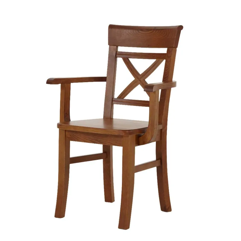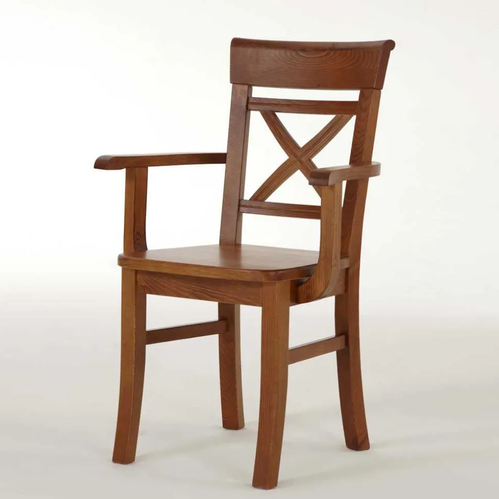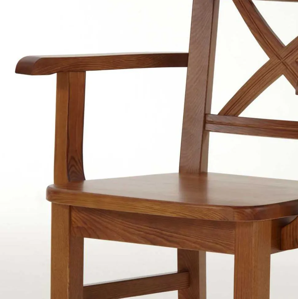 Die Stühle zeichnen sich durch ihr charmant rustikales Design aus, das Gemütlichkeit in jeden Raum bringt. Mit einer Breite von 61 cm, einer Höhe von 94 cm und einer Tiefe von 43 cm bieten sie großzügigen Sitzkomfort. Die Sitzhöhe von ca. 46 cm sowie die Sitztiefe und -breite sind optimal bemessen, um bequemes Sitzen zu ermöglichen. Besonders hervorzuheben sind die bequemen Armlehnen und die stilvoll gestaltete Rückenlehne mit X-förmigen Verstrebungen, die den Stühlen eine besondere Note verleihen.