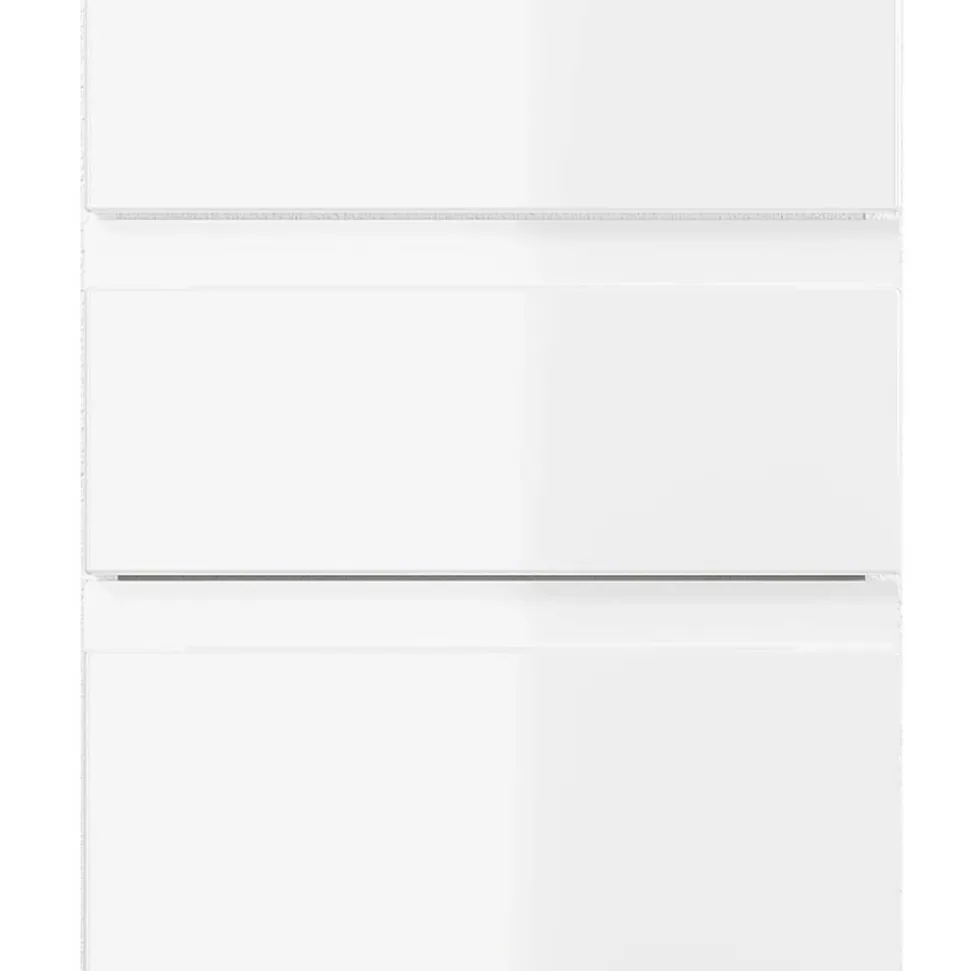 Die Fronten bestehen aus MDF-Holzwerkstoff mit tiefgezogener Folierung, wodurch eine makellose Oberfläche ohne sichtbare Übergänge entsteht. Der melaminbeschichtete Spanplatten-Korpus ist pflegeleicht und widerstandsfähig gegen Feuchtigkeit. Stoßfeste ABS-Kanten bieten zusätzlichen Schutz und sorgen für eine lange Lebensdauer.