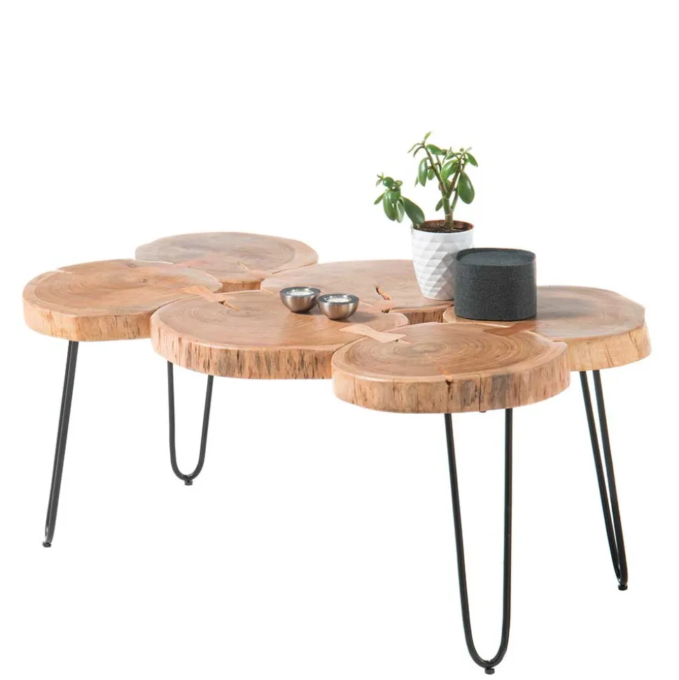 - Tischplatte besteht aus sechs Scheiben eines Baumstammes mit dekorativen Schwalbenschwanzverbindungen