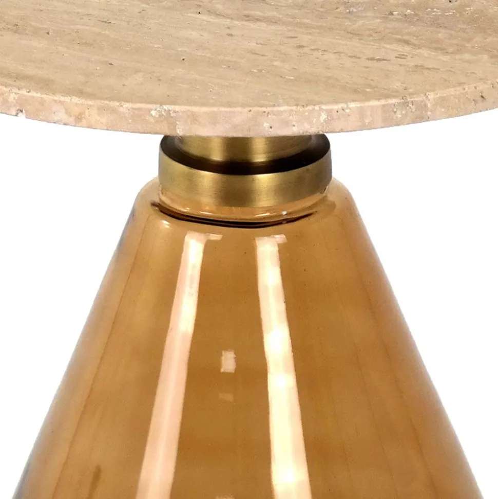Der kegelförmige Sockel aus braun getöntem Glas trägt die Marmorplatte mit Leichtigkeit und Anmut. Das zarte Schimmern des Glases verleiht dem Tisch eine fast schwebende Wirkung, während die Metallmanschette oben einen stilvollen Akzent setzt und das Design perfekt abrundet. Diese Kombination aus Transparenz, Wärme und Glanz verleiht jedem Raum eine luxuriöse, aber zugleich wohnliche Atmosphäre.