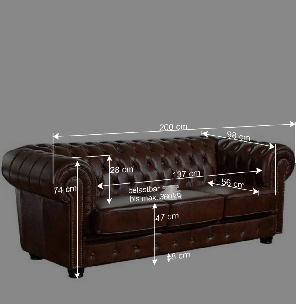Mit einer komfortablen Sitzhöhe von ca. 47 cm und einer Sitztiefe von 56 cm bietet die Chesterfield-Garnitur „Pluna“ eine entspannte und ergonomische Sitzposition. Diese Maße sind ideal, um eine bequeme Haltung zu fördern und sowohl beim Sitzen als auch beim Aufstehen Komfort zu gewährleisten. Die lose einliegenden Sitzkissen, die mit Klettverschlüssen am Korpus fixiert werden, bleiben stets an ihrem Platz und bieten zusätzlichen Komfort. Diese innovative Befestigungstechnik verhindert ein Verrutschen der Kissen und sorgt dafür, dass sie immer optimal positioniert sind.