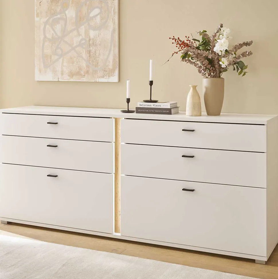 Qualität, die man spürt: Die Front aus stabilem MDF und der Korpus aus langlebiger Spanplatte machen dieses Sideboard nicht nur robust, sondern auch optisch anspruchsvoll. MDF zeichnet sich durch seine glatte, makellose Oberfläche aus, die perfekt für moderne Designs geeignet ist. Spanplatten sorgen für ein solides Fundament, das dennoch leicht genug ist, um den Aufbau mühelos zu gestalten. Die folierte und tiefgezogene Oberfläche vereint Ästhetik und Funktionalität, denn sie ist besonders pflegeleicht – ein feuchtes Tuch genügt, um das Sideboard mühelos zu reinigen.
