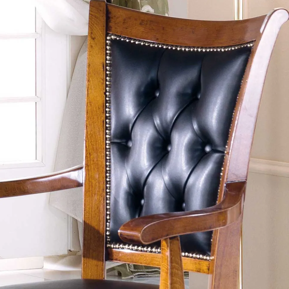 Die wertige Schaumstoffpolsterung der Sitz- und Rückenfläche zusammen mit dem pflegeleichten Kunstlederbezug in Schwarz (100 % Polyurethan) bietet höchsten Sitzkomfort und einfache Pflege. Die kunstvolle Dekoration mit Ziernägeln und die gesteppte sowie kapitonierte Rückenlehne verleihen dem Stuhl eine unverwechselbare Eleganz.