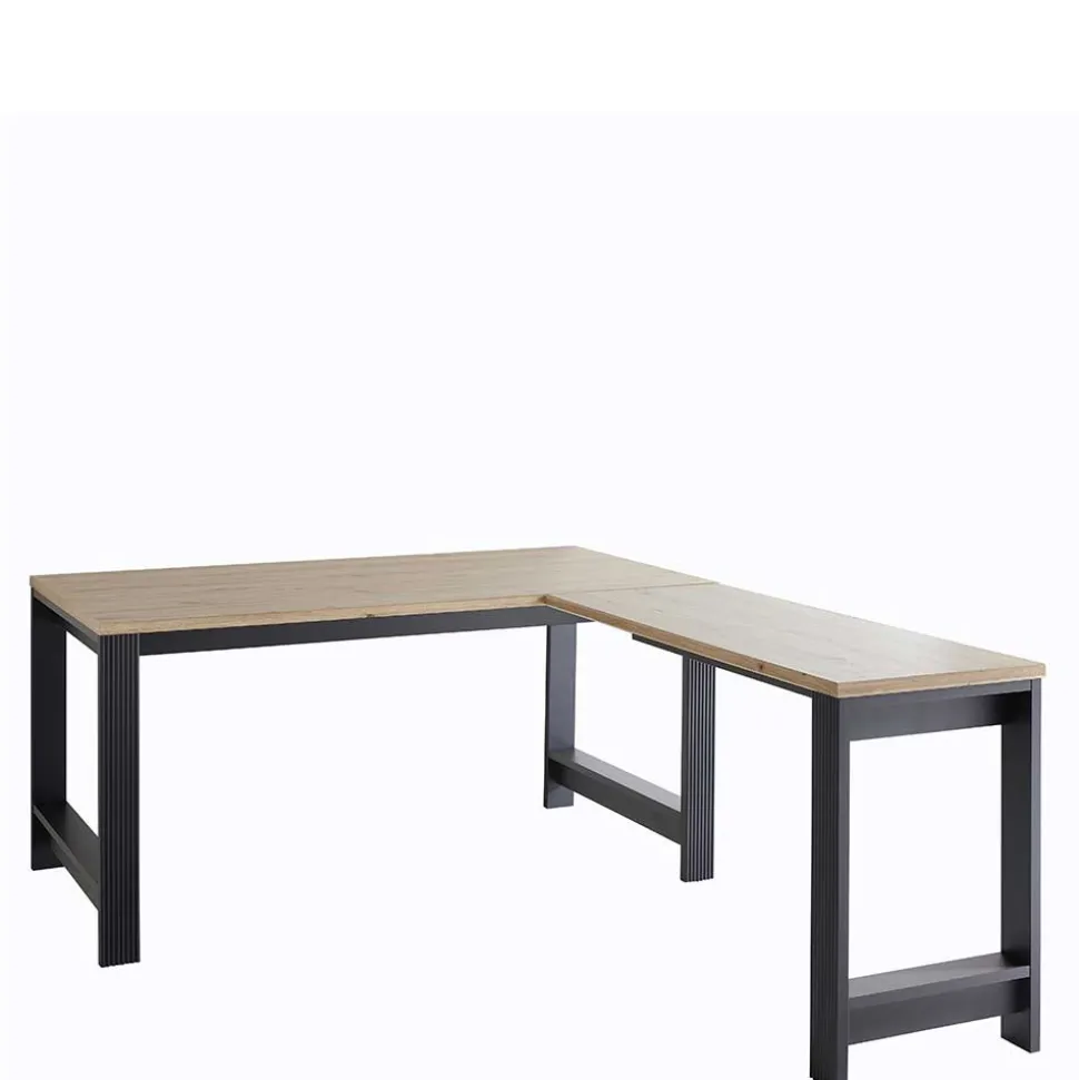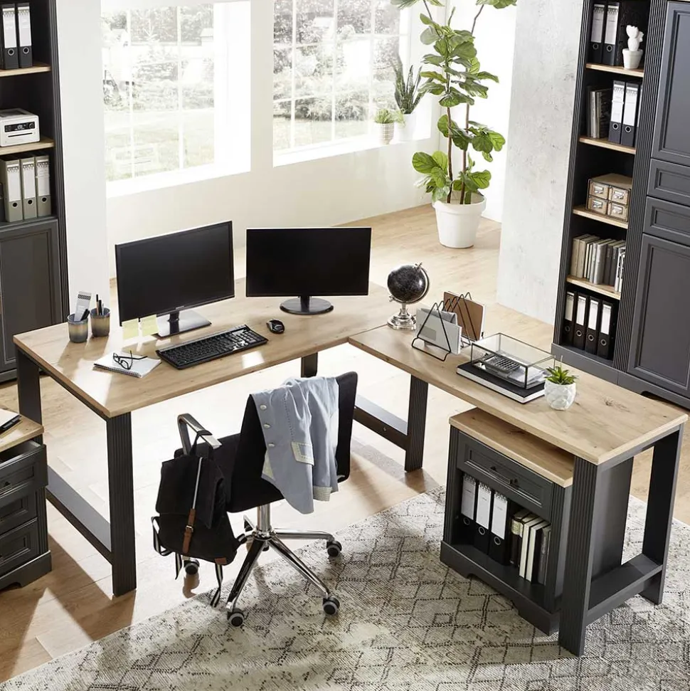 - Geräumiger Eckschreibtisch in Dunkelgrau und Eichefarben