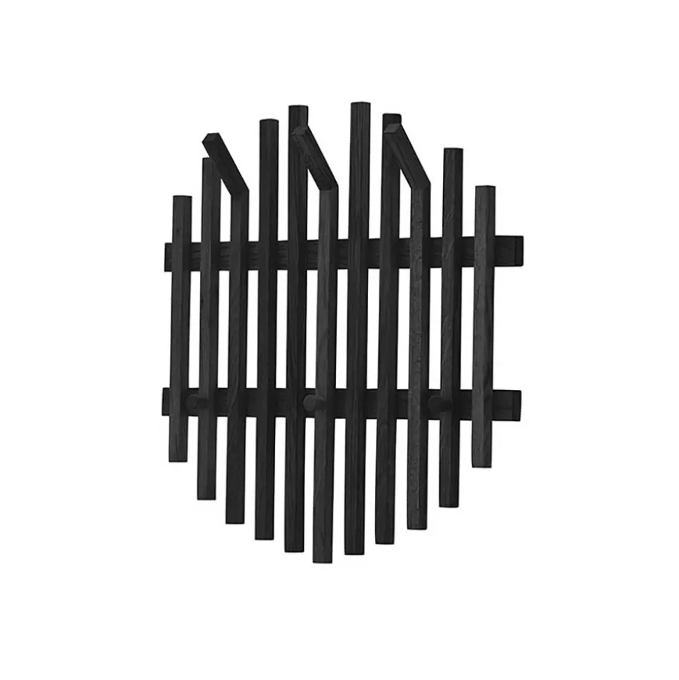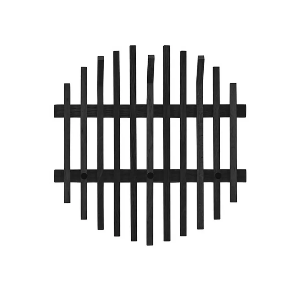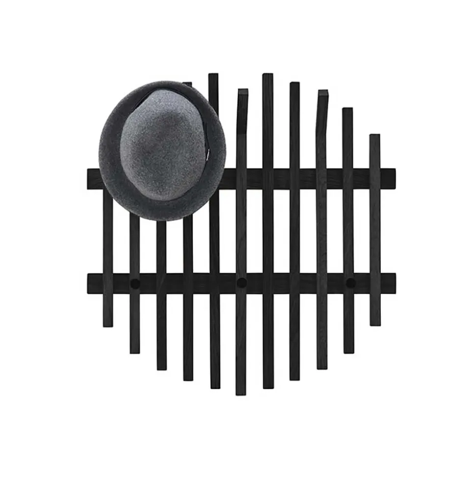 Die Design Garderobe „Gangizo“ besteht aus robustem, massivem Eichenholz, das durch die Schwarzbeizung eine besondere Tiefe und Eleganz erhält. Die natürliche Maserung des Holzes bleibt dezent sichtbar und verleiht dem Möbelstück einen authentischen Charakter. Die Konstruktion setzt sich aus elf vertikalen Holzleisten zusammen, die auf zwei horizontalen, breiteren Eichenholzleisten befestigt sind. Die variierenden Längen der Leisten ergeben eine harmonische, nahezu runde Silhouette, die das Auge des Betrachters auf subtile Weise fesselt.
