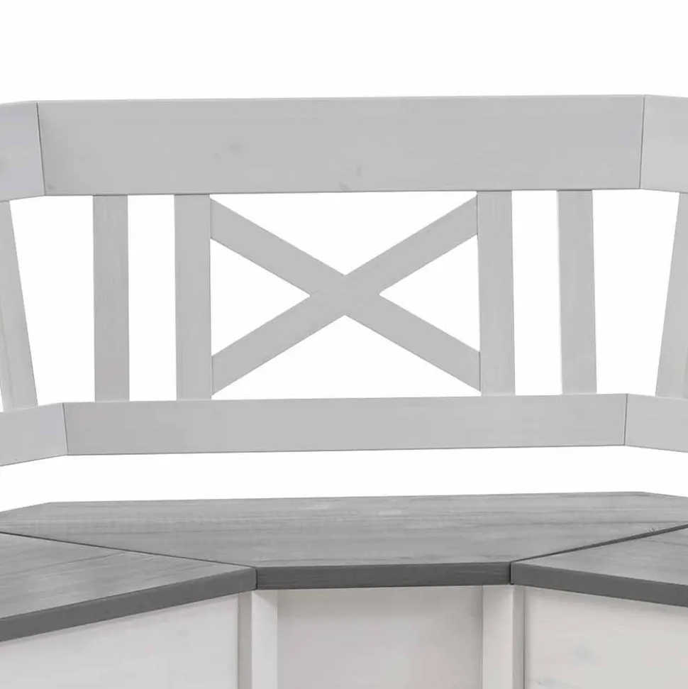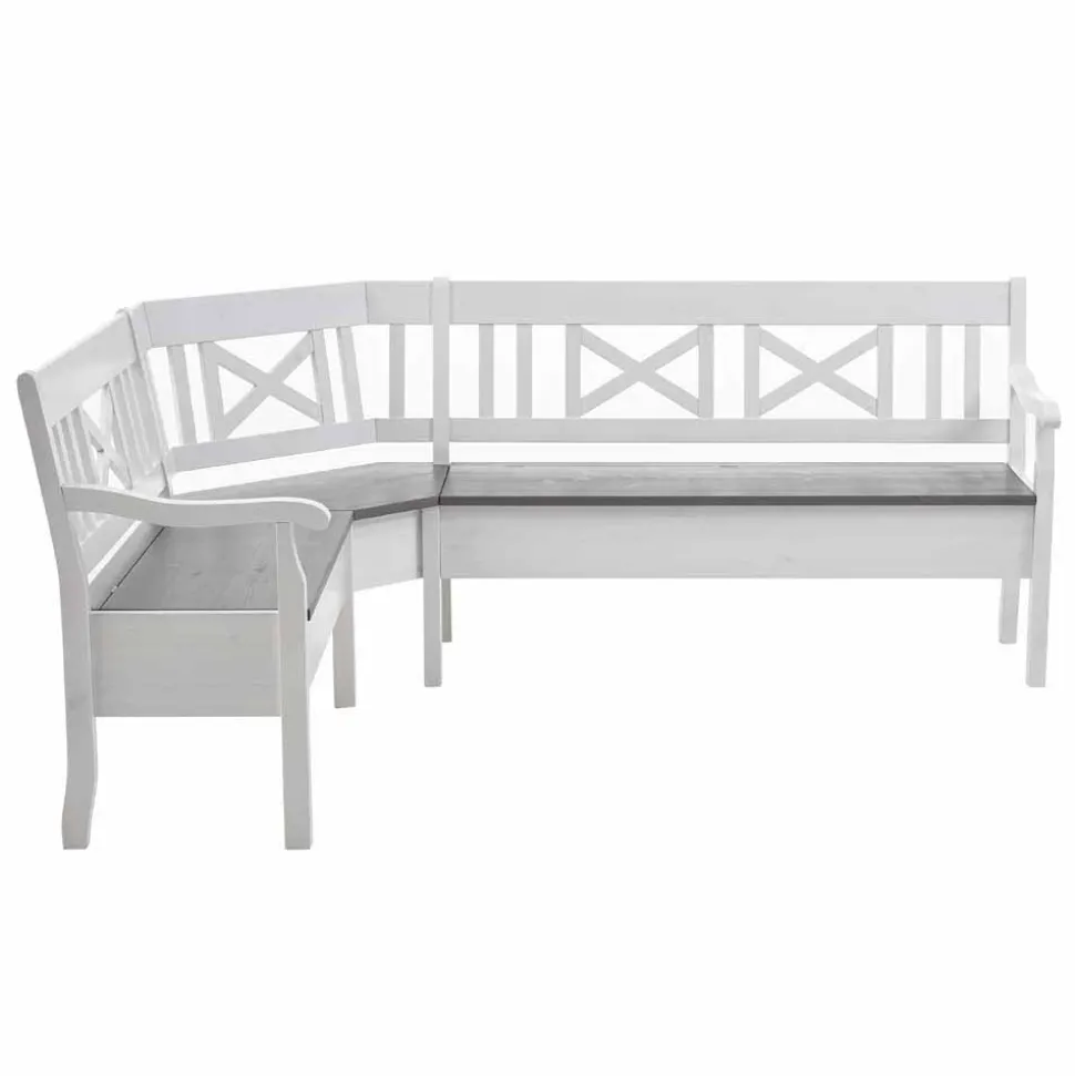 Die Oberflächen der Eckbank sind in einem stilvollen Weiß gehalten, während die Sitzfläche in einem eleganten Grauton gebeizt und lackiert wurde. Die durchscheinende Maserung verleiht dem Möbelstück eine natürliche und lebendige Optik, die perfekt zu modernen, rustikalen oder klassischen Einrichtungsstilen passt. Die hochwertige Lackierung schützt das Holz und sorgt für eine pflegeleichte Oberfläche, die auch im Alltag problemlos zu reinigen ist.
