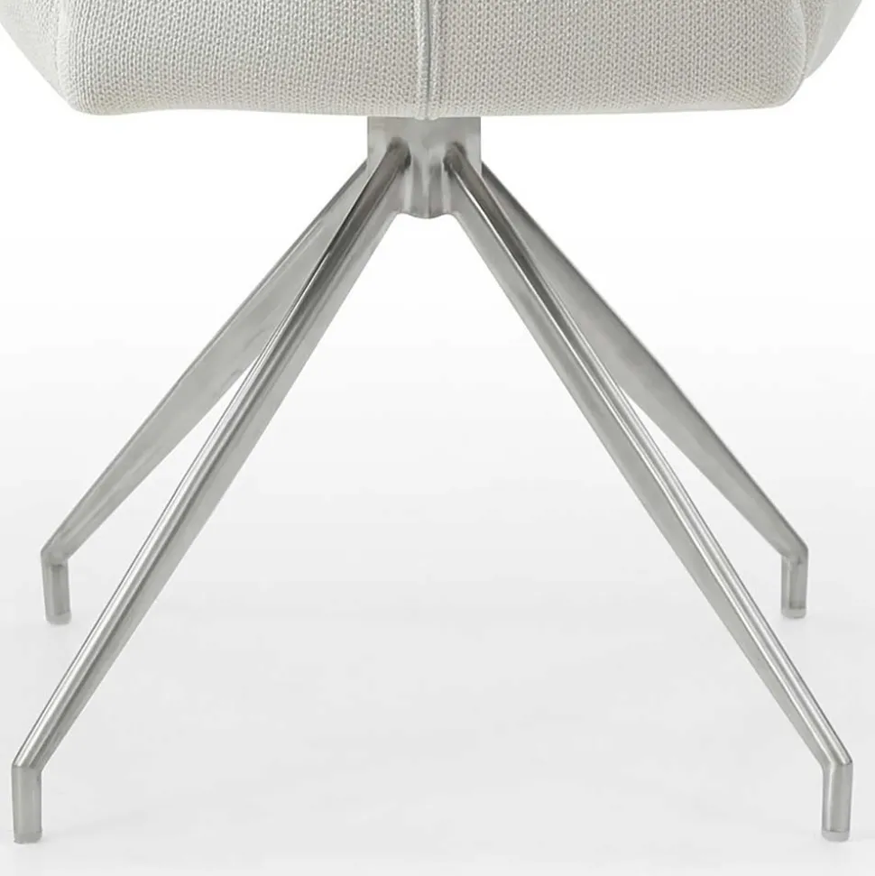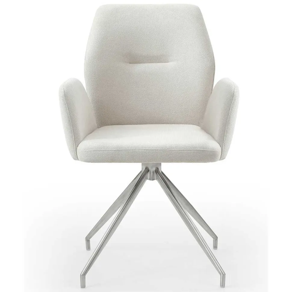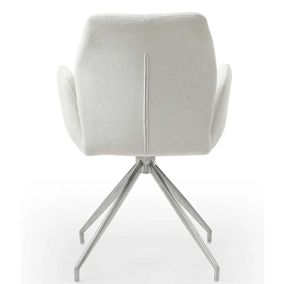 Die vier passenden Stühle sind mit einem widerstandsfähigen Strukturstoff in Cremeweiß (100 % Polyester) bezogen. Der Stoff besticht durch eine hohe Abriebfestigkeit von 50.000 Scheuertouren nach Martindale und eine gute Lichtbeständigkeit, sodass er lange seine elegante Optik bewahrt. Die komfortable Schaumstoffpolsterung, ergonomisch geformte Arm- und Rückenlehnen sowie die dekorativen Ziernähte sorgen für besten Sitzkomfort und eine ansprechende Optik. Für Stabilität sorgt das Spider-Vierfußgestell aus rostfreiem Edelstahl, das zudem mit seiner besonderen Form einen echten Blickfang darstellt.