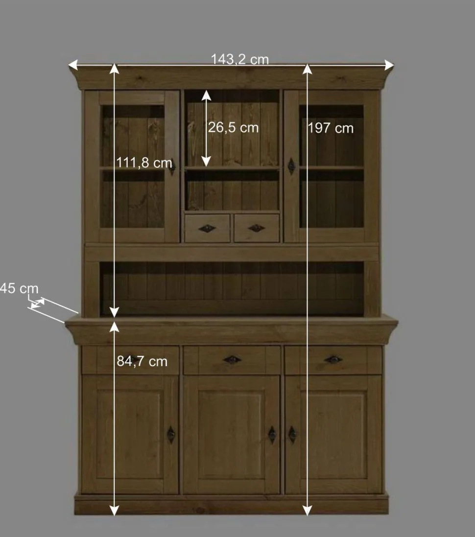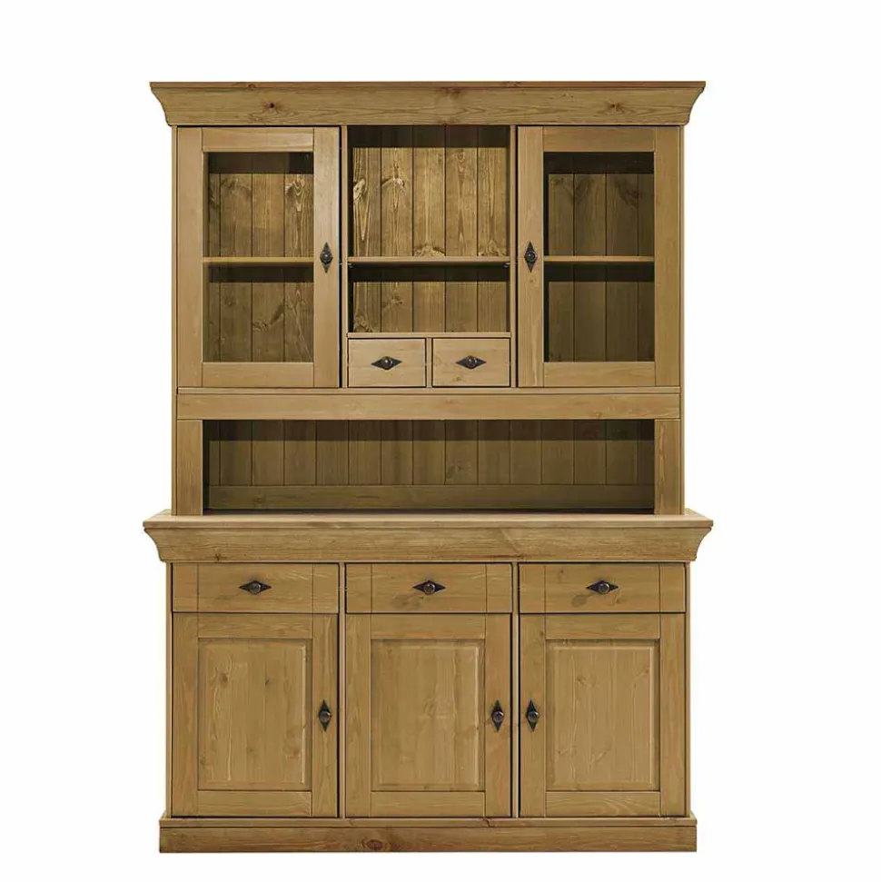 Zwei kleine, offene Fächer oben und ein großes, offenes Fach von etwa 26,5 cm Höhe bieten zusätzliche Präsentationsfläche für Ihre schönsten Stücke. Die sichtbare Rückwand in stilvoller Paneel-Optik rundet das stimmige Gesamtbild charmant ab. Mit den fein gefrästen Kranz- und Deckleisten, den Metallknopfgriffen und dem geschlossenen Massivholzgestell wirkt dieser Schrank gleichzeitig bodenständig und edel – ein echter Blickfang in Küche, Wohn- oder Esszimmer.