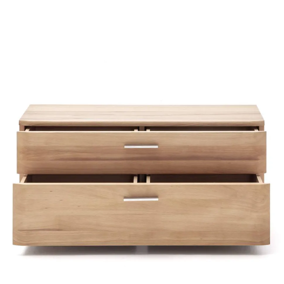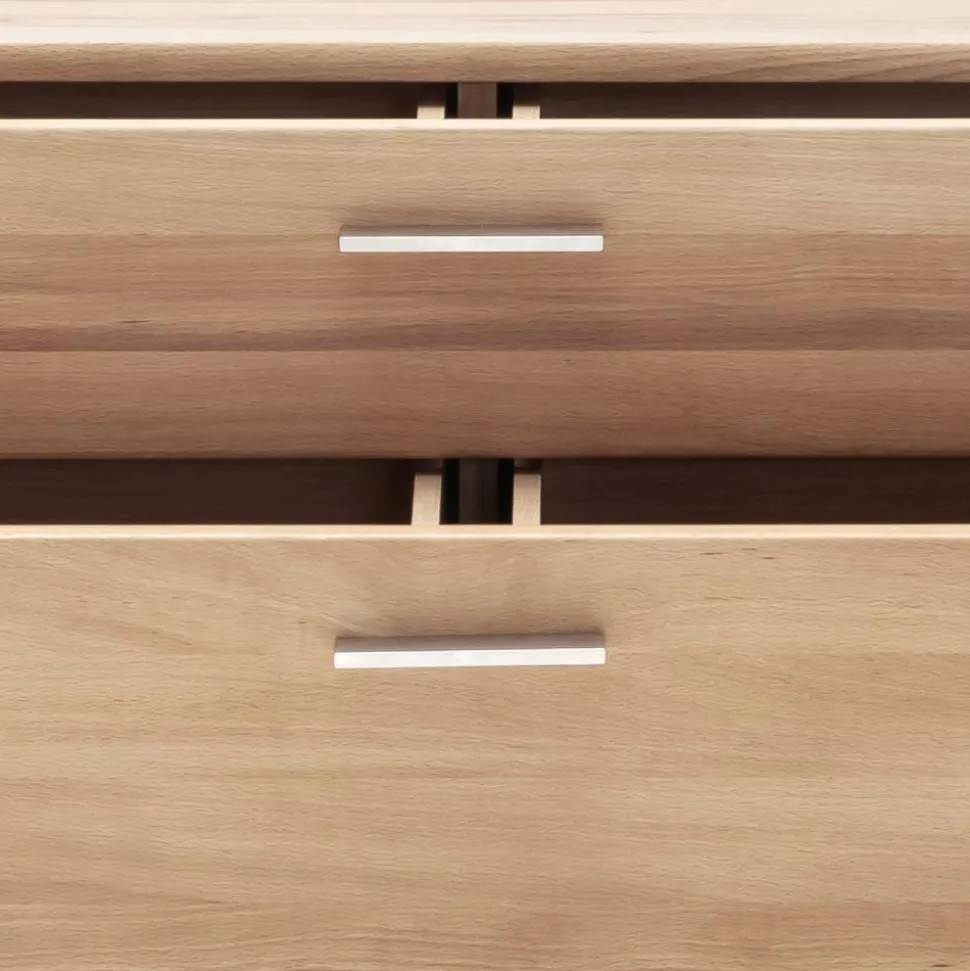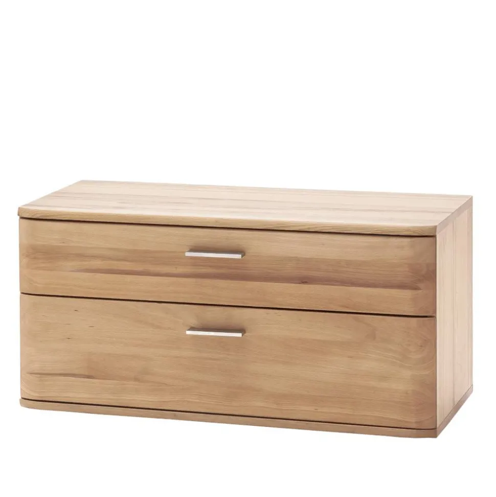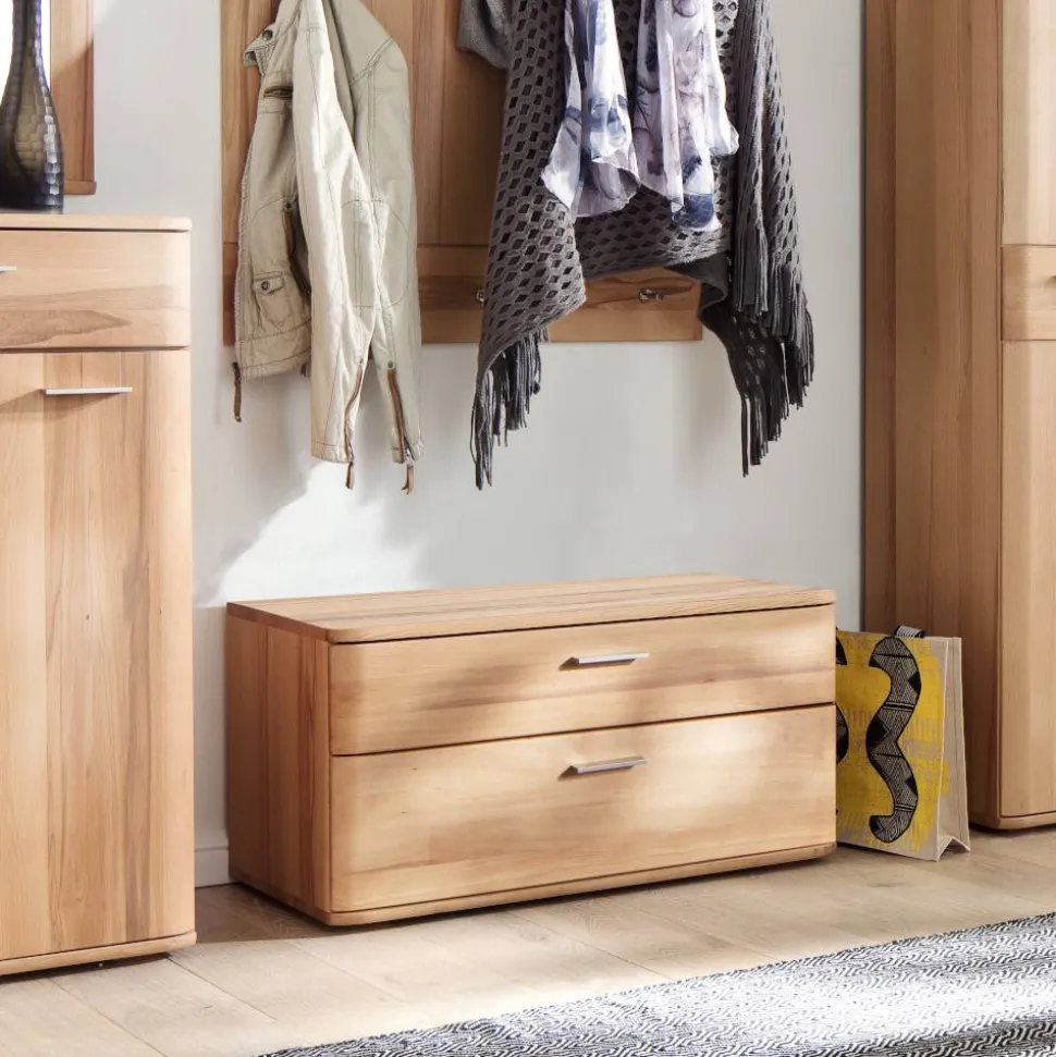 Die Front der Garderobenbank besteht aus Kernbuche Massivholz, während der Korpus aus robustem, echtholzfurniertem Holzwerkstoff gefertigt ist. Die Bank steht auf flachen Holzfüßen mit den Maßen 6 x 1,5 x 6 cm und verfügt über silberfarbene Metallgriffleisten, die einen modernen Akzent setzen. Das Ober- und Unterboden-Design ist vorne mit massiven Anleimern verstärkt, was die Stabilität zusätzlich erhöht.
