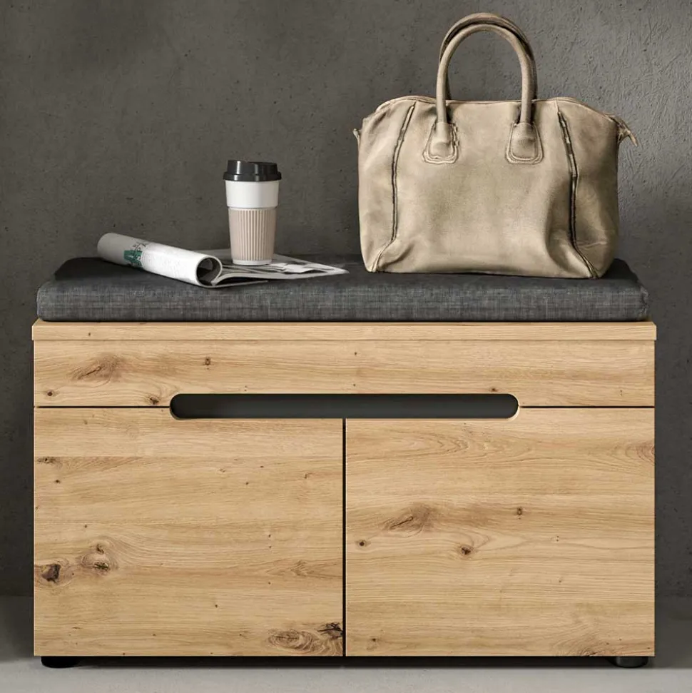 Die Garderobenbank „Norja“ ist die perfekte Lösung für einen aufgeräumten und einladenden Eingangsbereich. Sie bietet nicht nur eine komfortable Sitzgelegenheit, sondern überzeugt gleichzeitig mit praktischem Stauraum für Schuhe, Accessoires oder andere Alltagsgegenstände. Das harmonische Zusammenspiel aus natürlicher Wildeiche-Holzoptik und edlem Grau fügt sich mühelos in verschiedenste Wohnstile ein und verleiht Ihrem Flur eine warme, wohnliche Atmosphäre.