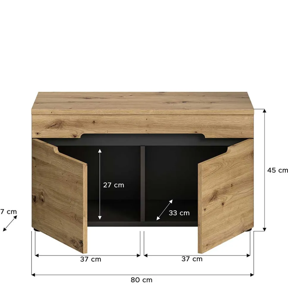Mit einer Breite von 80 cm, einer Höhe von 45 cm (ohne Polsterauflage) und einer Tiefe von 37 cm passt die Garderobenbank auch in kleinere Flure oder Dielen. Trotz der kompakten Maße überzeugt sie mit einer durchdachten Raumaufteilung und viel Stauraum.