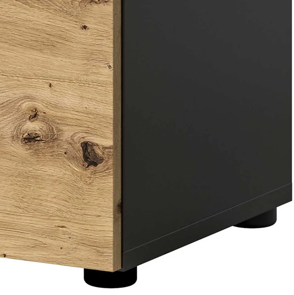 Hinter den beiden Drehtüren verbirgt sich jeweils ein geräumiges Fach, das sich ideal zur Aufbewahrung von Schuhen oder anderen Gegenständen eignet. Dank der hochwertigen Soft-Close-Beschläge lassen sich die Türen leise und sanft schließen. So bleibt Ihr Eingangsbereich stets aufgeräumt und übersichtlich.