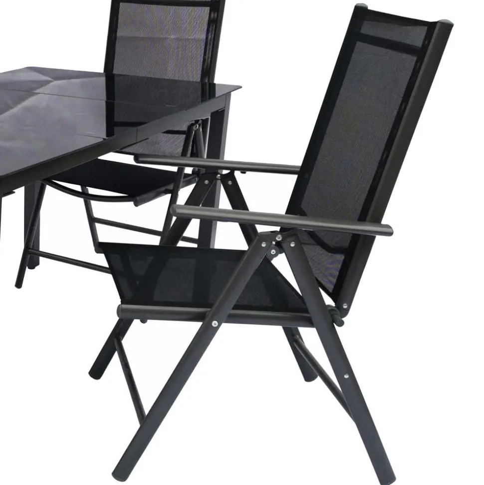 Die Stühle der Sitzgruppe sind mit einem speziellen Textilgewebe überzogen, das aus 70 % Polychlorid und 30 % Polyester besteht. Dieses Material bietet eine Reihe von Vorteilen: Es ist pflegeleicht, witterungsbeständig und sorgt gleichzeitig für ein komfortables Sitzerlebnis. Das Gewebe ist atmungsaktiv, wodurch auch an heißen Tagen ein angenehmes Sitzklima gewährleistet wird. Die hohen Rückenlehnen der Stühle sind dreifach verstellbar, sodass Sie die Sitzposition individuell anpassen können – ideal für lange, entspannte Nachmittage im Freien. Durch die Verstellbarkeit lässt sich die Sitzposition optimal auf Ihre Bedürfnisse abstimmen, ob Sie nun ein Buch lesen, ein Nickerchen machen oder einfach die Sonne genießen möchten.