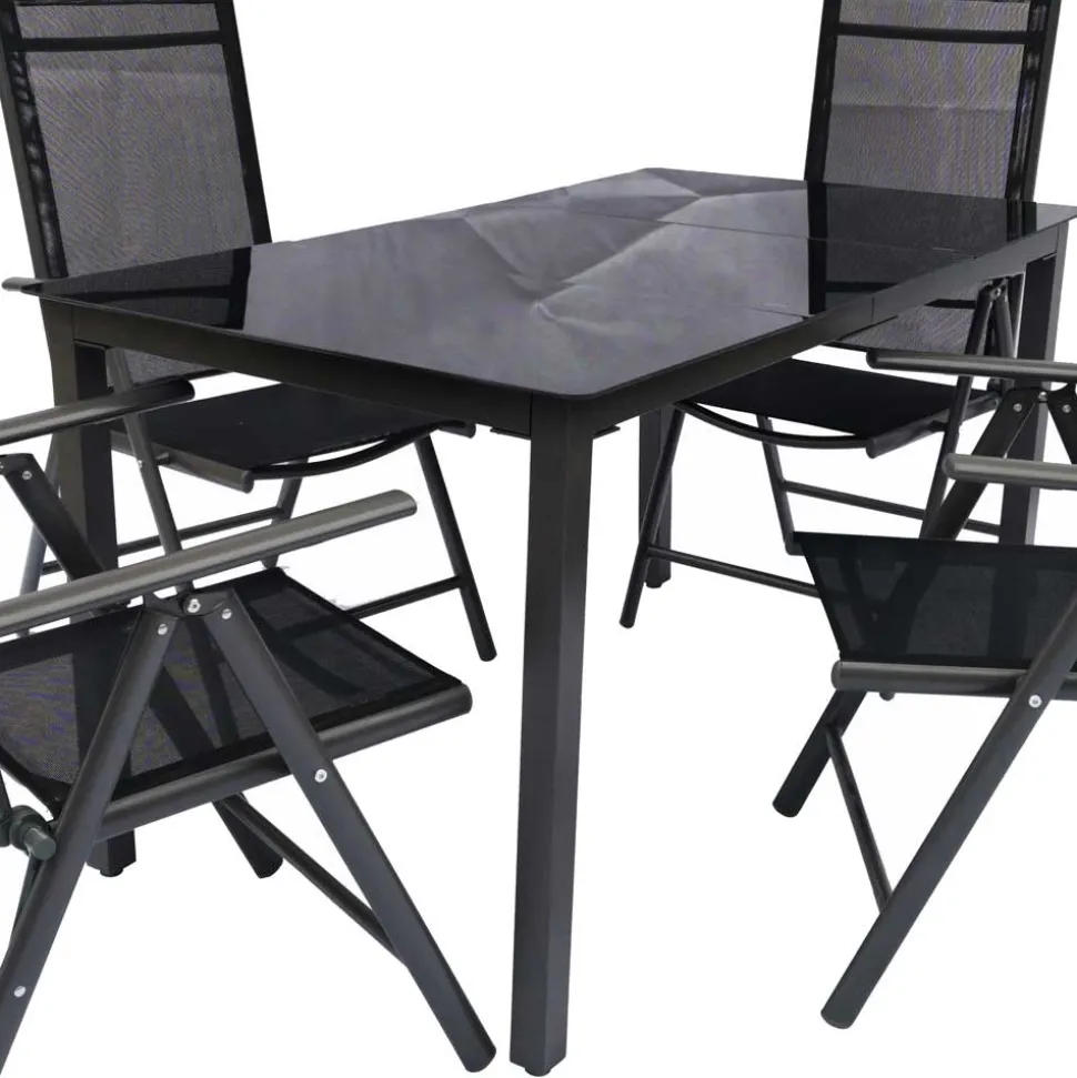 Für die Herstellung der Outdoor Sitzgruppe „Trexana“ wurden nur die besten Materialien verwendet, um Langlebigkeit und Robustheit zu gewährleisten. Das Gestell aus Metall in edlem Anthrazit bietet eine solide und stabile Basis. Die Tischplatte ist aus schwarzem Sicherheitsglas (ESG) gefertigt, das für seine besondere Widerstandsfähigkeit bekannt ist. ESG, kurz für Einscheibensicherheitsglas, wird durch ein spezielles thermisches Verfahren gehärtet, was es besonders bruchsicher macht. Diese Tischplatte kann Gewichte von bis zu 70 kg tragen und ist somit ideal für den täglichen Gebrauch sowie für gesellige Zusammenkünfte im Freien geeignet. Das Material zeichnet sich nicht nur durch seine Stabilität aus, sondern auch durch eine einfache Pflege und Widerstandsfähigkeit gegenüber Kratzern.
