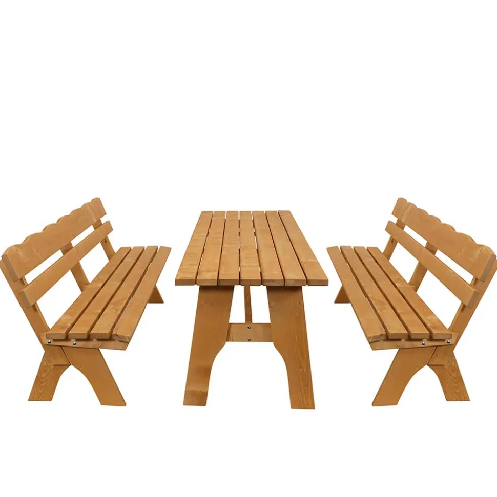 Hergestellt aus erstklassigem Kiefer Massivholz, überzeugt die Sitzgruppe mit ihrer herausragenden Stabilität und natürlichen Schönheit. Kiefernholz ist bekannt für seine Widerstandsfähigkeit, Langlebigkeit und die wunderschöne Maserung, die jedem Möbelstück einen individuellen Charakter verleiht. Dank der wasserfesten Oberfläche, die im Tauchverfahren hellbraun imprägniert wurde, bleibt das Holz optimal geschützt – selbst bei wechselnden Witterungsbedingungen.