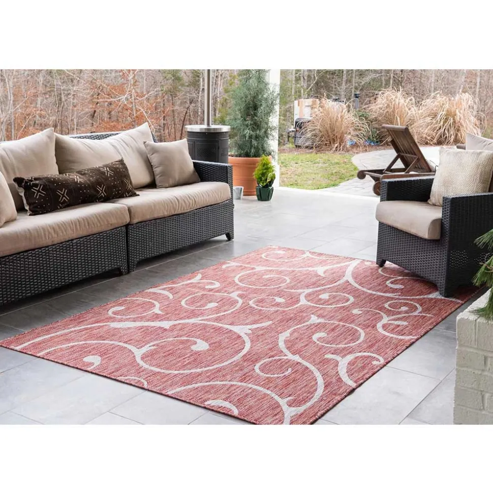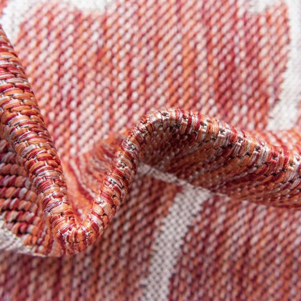 Der gewebte Teppich „Rick“ bringt mit seinem rostroten Grund und den cremefarbenen Ornamenten eine warme, fast schon sinnliche Note in Ihre Wohn- und Außenbereiche. Das charmante Design erinnert an traditionelle Muster aus dem Orient, modern interpretiert für zeitgemäße Einrichtungskonzepte. Ob auf der Terrasse, im Wintergarten oder im Wohnzimmer – dieser Teppich setzt ein stilvolles Statement mit Charakter.