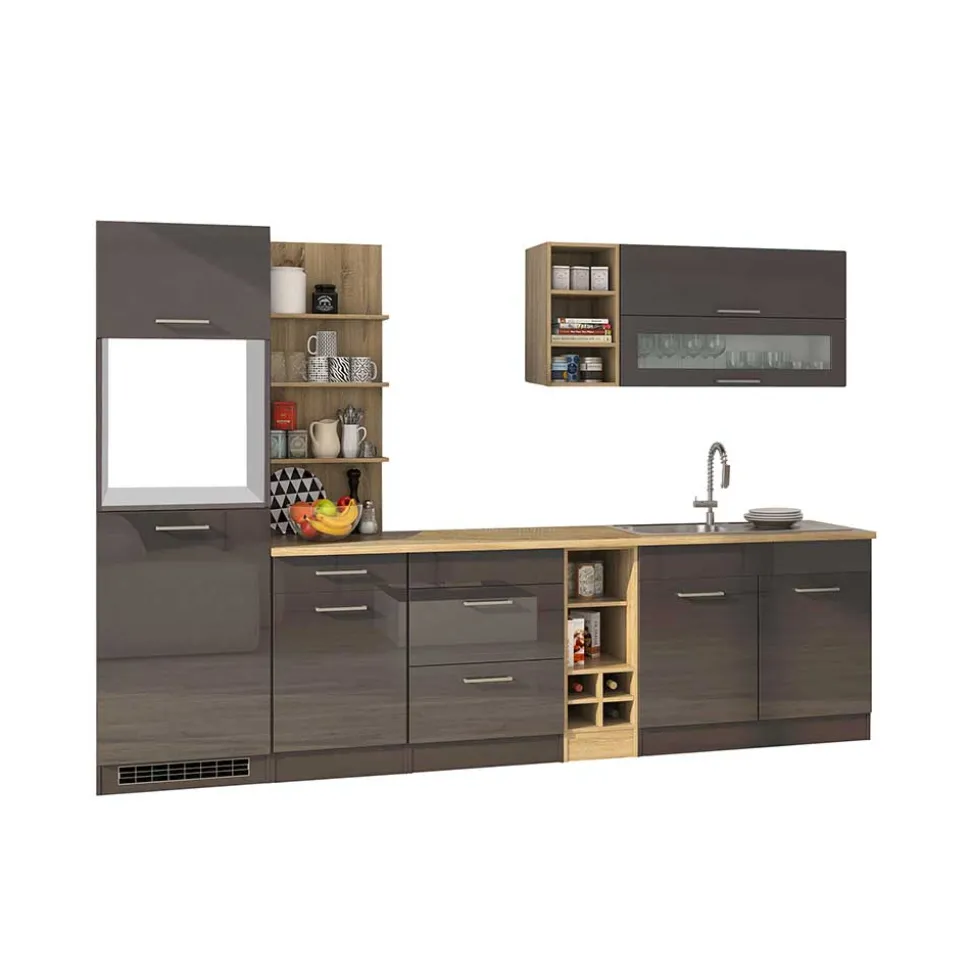 Zum Einsatz kommen widerstandsfähige und pflegeleichte Materialien: Die Fronten bestehen aus MDF – einem besonders formstabilen Werkstoff, der eine glatte Oberfläche und hohe Belastbarkeit bietet. Für die Korpusse wurde robuste Spanplatte verwendet, die sich durch geringes Gewicht und Stabilität auszeichnet. Die Arbeitsplatte und die offenen Regalelemente wurden in täuschend echter Sonoma Eiche Holzoptik gefertigt und mit einer Melaminbeschichtung veredelt. Diese Beschichtung schützt die Oberfläche vor Kratzern, Feuchtigkeit und Hitze und lässt sich leicht reinigen – ideal für den täglichen Gebrauch. Die grauen Fronten sind mit einer hochwertigen Hochglanzfolie überzogen, die mit modernem Verfahren nahtlos aufgetragen wird. Das Ergebnis: eine glänzende, spiegelglatte Oberfläche, die Eleganz ausstrahlt und pflegeleicht bleibt.