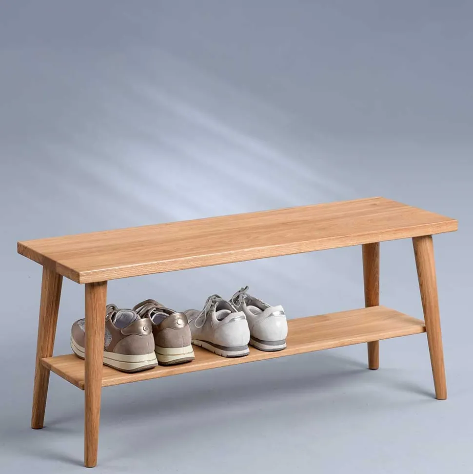 Die Garderobenbank „Liorys“ ist aus massiver Wildeiche gefertigt und verfügt über eine geölte Holzoberfläche. Das schräge Vierfußgestell sorgt für einen sicheren Stand und Stabilität.