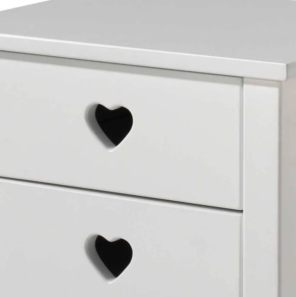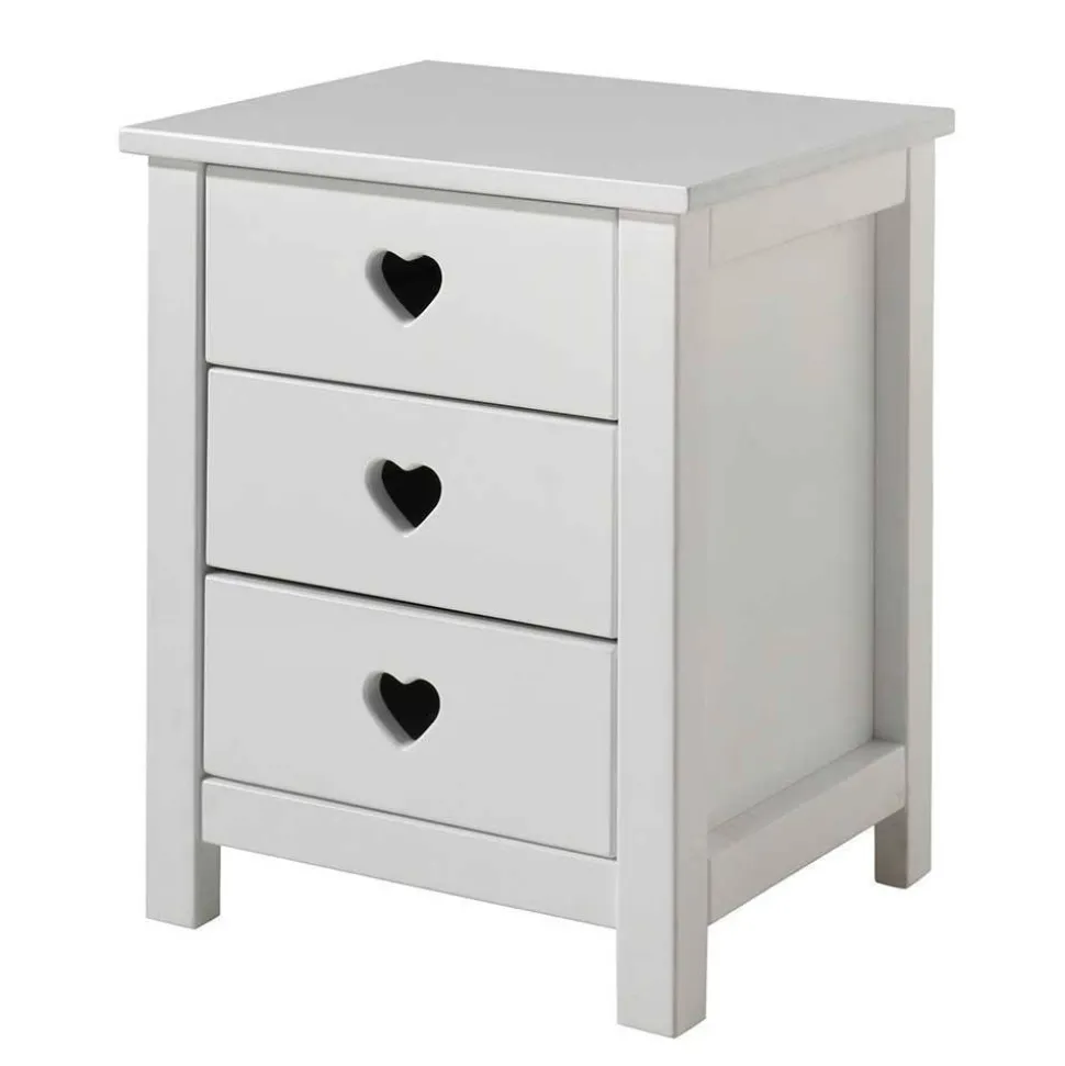 Die Nachtkommode des Sets ist nicht nur praktisch, sondern auch ein echter Hingucker. Mit drei Schubladen, die sich dank griffloser Fronten und herzförmiger Aussparungen leicht öffnen lassen, bietet sie Platz für Bücher, Spielzeug oder andere Kleinigkeiten. Die Schubladen laufen auf stabilen Metallauszügen und sorgen für eine reibungslose Nutzung.