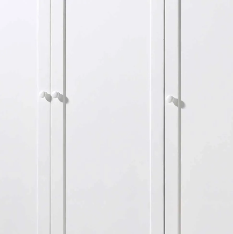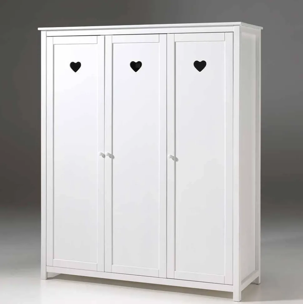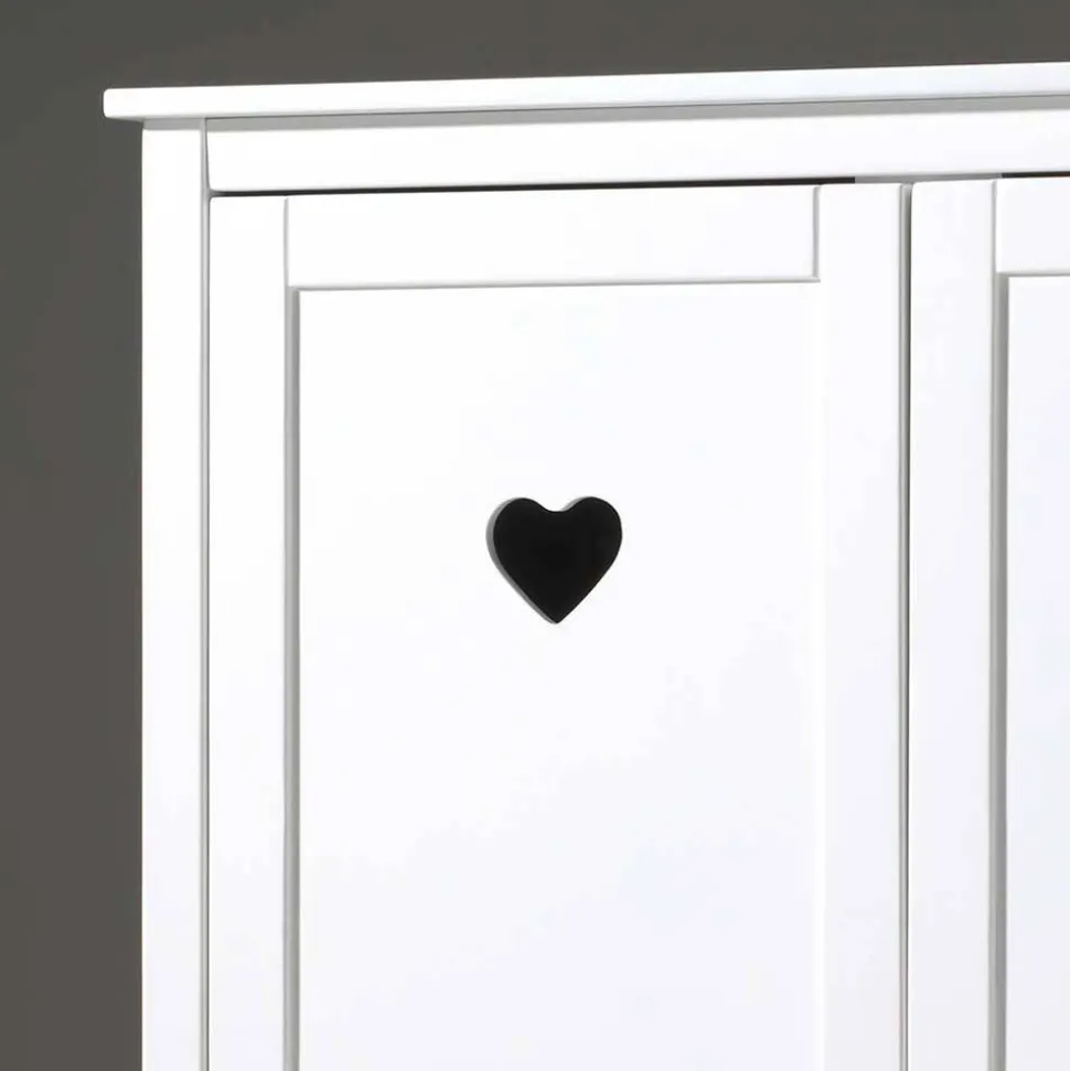 Der dreitürige Kleiderschrank bietet jede Menge Platz für Kleidung, Spielzeug oder Accessoires. Hinter den beiden äußeren Türen finden sich ein fester Fachboden, eine Kleiderstange und ein verstellbarer Einlegeboden, ideal für hängende und gefaltete Kleidung. Die rechte Tür verbirgt fünf praktische Fächer, perfekt für alles, was geordnet und schnell griffbereit sein soll. Die dekorativen Herz-Ausschnitte an den Türen verleihen dem Schrank zusätzlich eine verspielte, romantische Note.