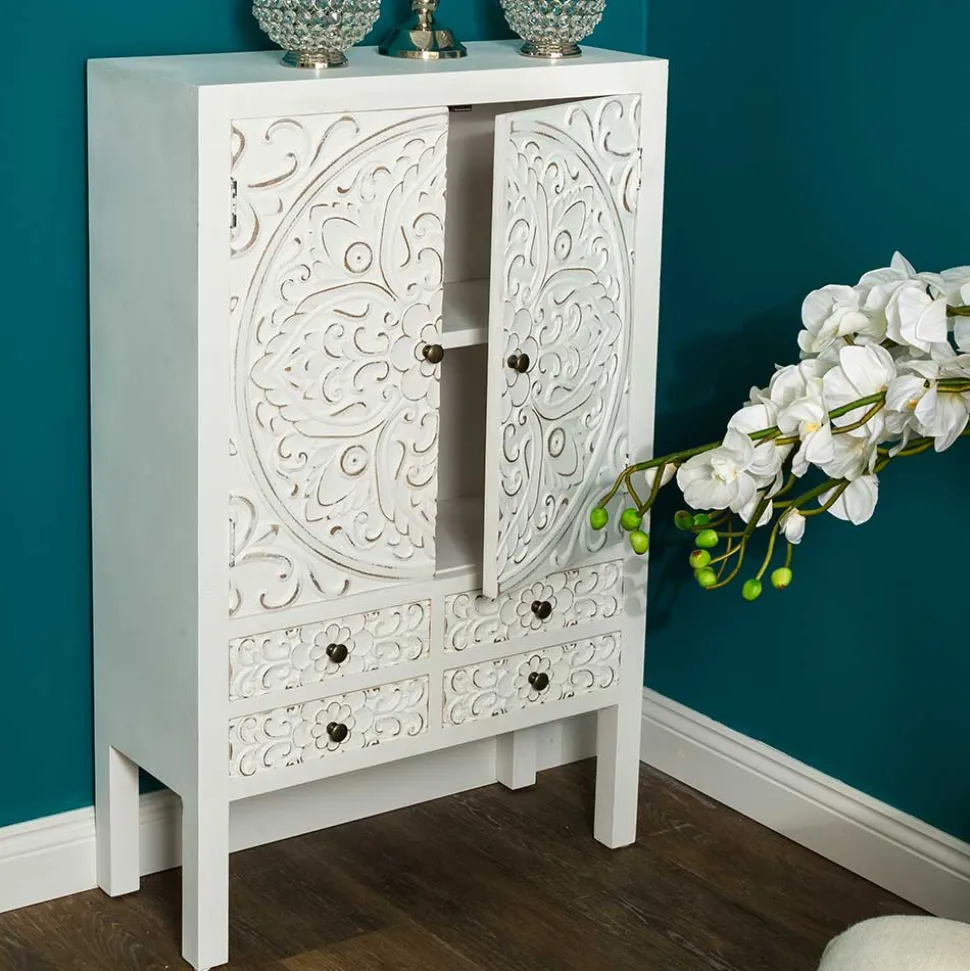 Tauchen Sie ein in die zauberhafte Welt des Orients! Mit dem Highboard Acacio holen Sie sich ein Möbelstück ins Haus, das mit seiner einzigartigen Mischung aus Eleganz und Exotik einen echten Blickfang darstellt. Die kunstvollen Ornamentmuster in goldenen Nuancen und die antikweißen, gewischten Holzoberflächen verleihen diesem Highboard seinen unverwechselbaren Charme. Ob als Stauraumwunder oder stilvolles Highlight – Acacio ist die perfekte Ergänzung für Ihr Zuhause.