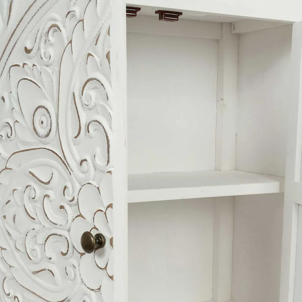 Hergestellt aus hochwertigem Eukalyptusholz und edlem Spiegelglas, vereint Acacio langlebige Qualität mit einer faszinierenden Optik. Eukalyptusholz besticht durch seine Robustheit, Feuchtigkeitsbeständigkeit und natürliche Schönheit. Die in Antikweiß gewischte Lackierung bringt den Vintage-Look perfekt zur Geltung und sorgt dafür, dass jedes Möbelstück einen individuellen Charakter erhält. Die gewollten Gebrauchsspuren unterstreichen den einzigartigen Stil – jedes Highboard ist ein Unikat.