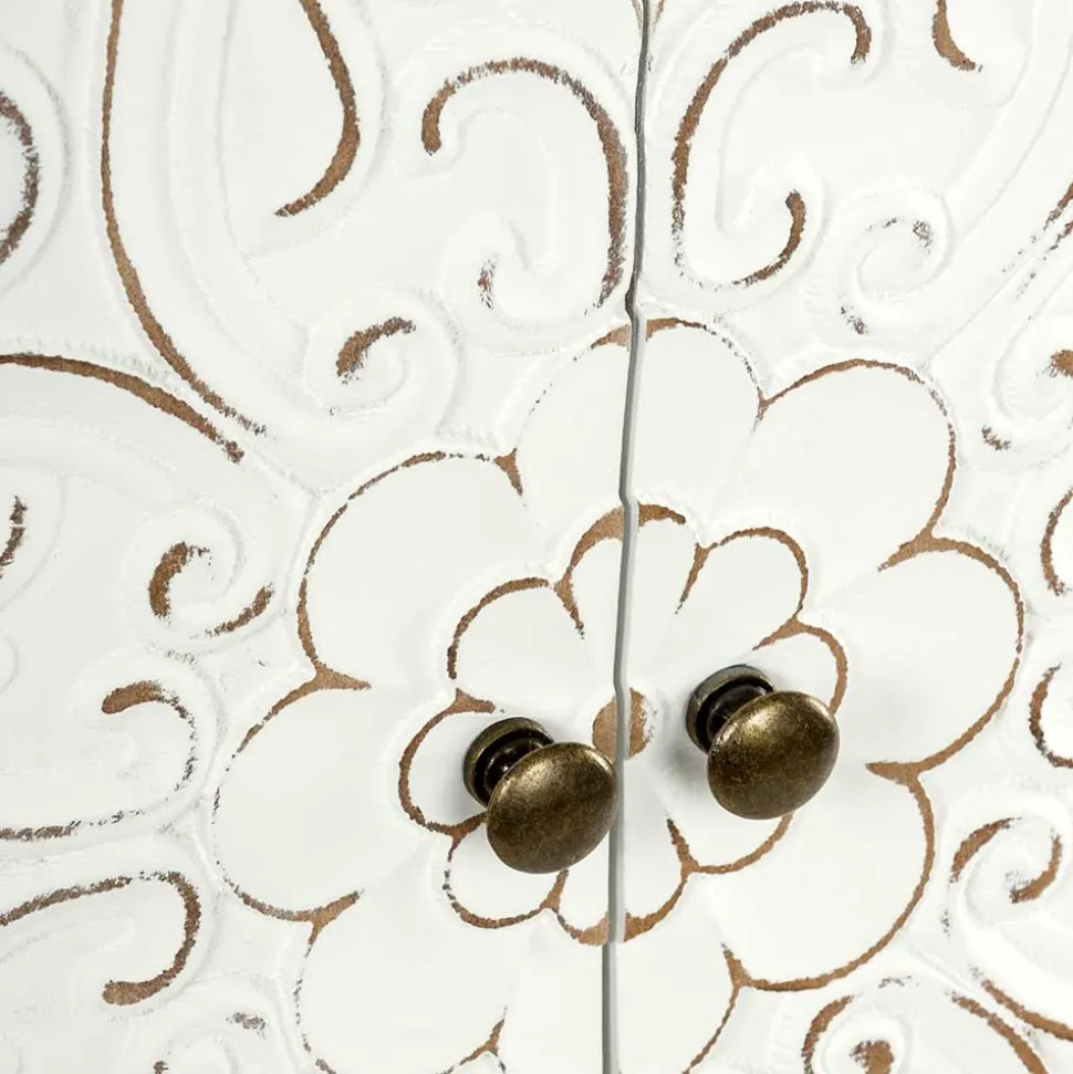 Acacio überzeugt nicht nur optisch, sondern auch funktional. Mit einer Breite von 63 cm, einer Höhe von 100 cm und einer Tiefe von lediglich 26 cm passt es selbst in kleinere Räume, ohne auf Stauraum zu verzichten. Im unteren Bereich finden sich vier praktische Schubladen, ideal für kleinere Gegenstände wie Schlüssel, Accessoires oder Dokumente. Hinter den zwei kunstvoll verzierten Türen mit altmessingfarbenen Metallknöpfen verbergen sich zwei Einlegeböden, die zusätzlichen Platz für Bücher, Geschirr oder dekorative Elemente bieten.