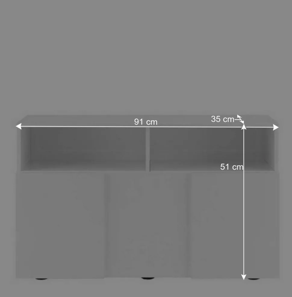 Mit ihren Maßen von 91 cm Breite, 51 cm Höhe und 35 cm Tiefe bietet die Kommode eine clevere Stauraumlösung. Eine geräumige Klappe bietet Platz für Schuhe, während die zwei offenen Fächer darüber Raum für Accessoires oder Deko-Elemente schaffen. Wertige Metallbeschläge sorgen für eine langlebige und stabile Verarbeitung. Die Rückwand aus Hartfaserplatte unterstreicht die hochwertige Konstruktion.
