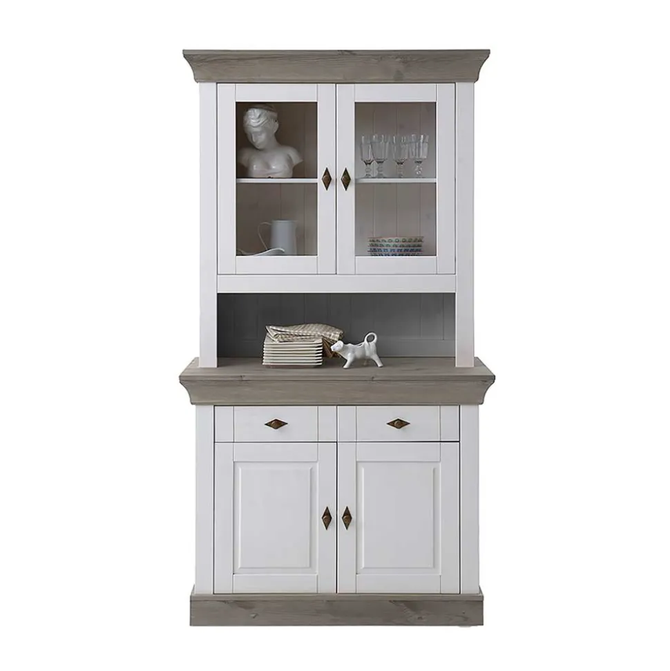 Dieses Schmuckstück setzt sich aus einer Anrichte und einem Aufsatz zusammen, die perfekt aufeinander abgestimmt sind. Die Anrichte verfügt über zwei Türen mit einer eleganten Krassettenfront und stabilen Metallbeschlägen. Hinter den Türen finden Sie jeweils einen Einlegeboden. Zwei geräumige Schubkästen mit Metallauszug ergänzen das Stauraumangebot in der Anrichte.