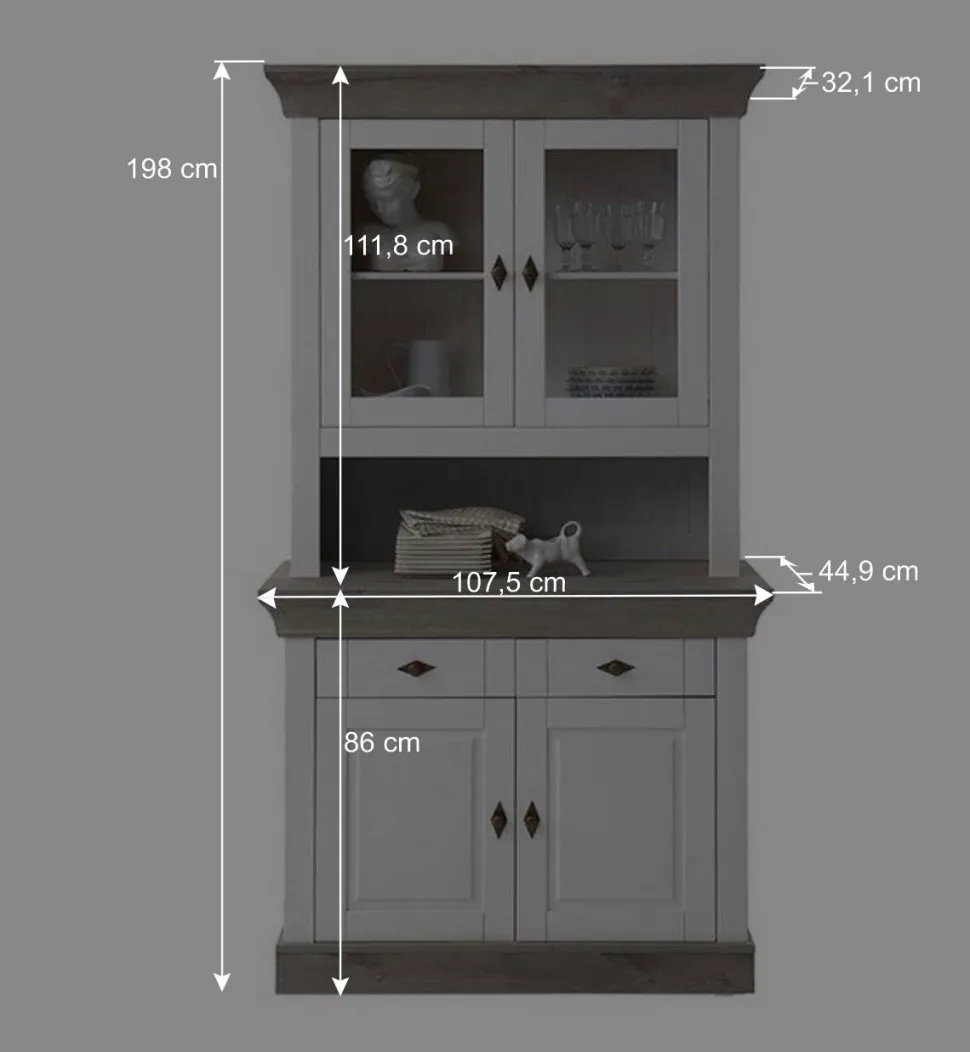 Mit einer Breite von 108 cm, einer Höhe von 197,8 cm und einer Tiefe von 45 cm bietet der Buffetschrank „Mirandesca“ ausreichend Stauraum und passt perfekt in Ihr Zuhause. Die aufwendig gefräste Zwischenplatte und die Kranzleiste verleihen ihm eine besonders hochwertige Ausstrahlung.