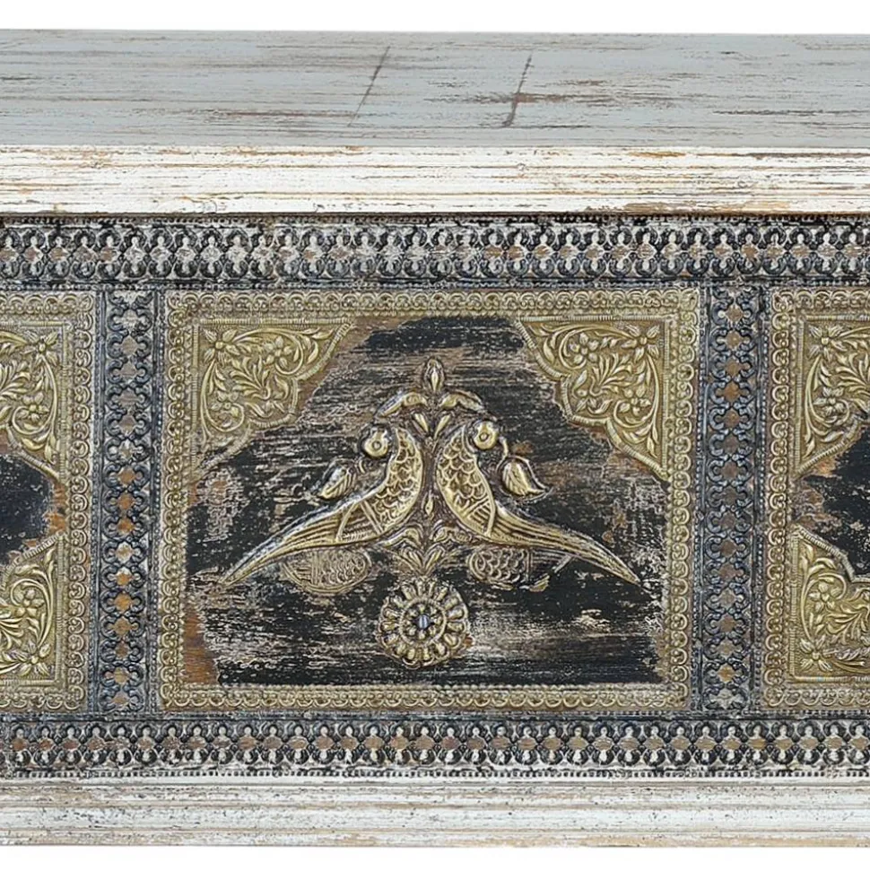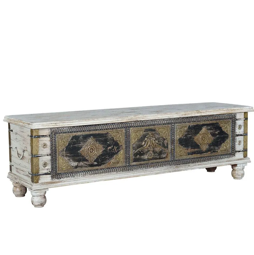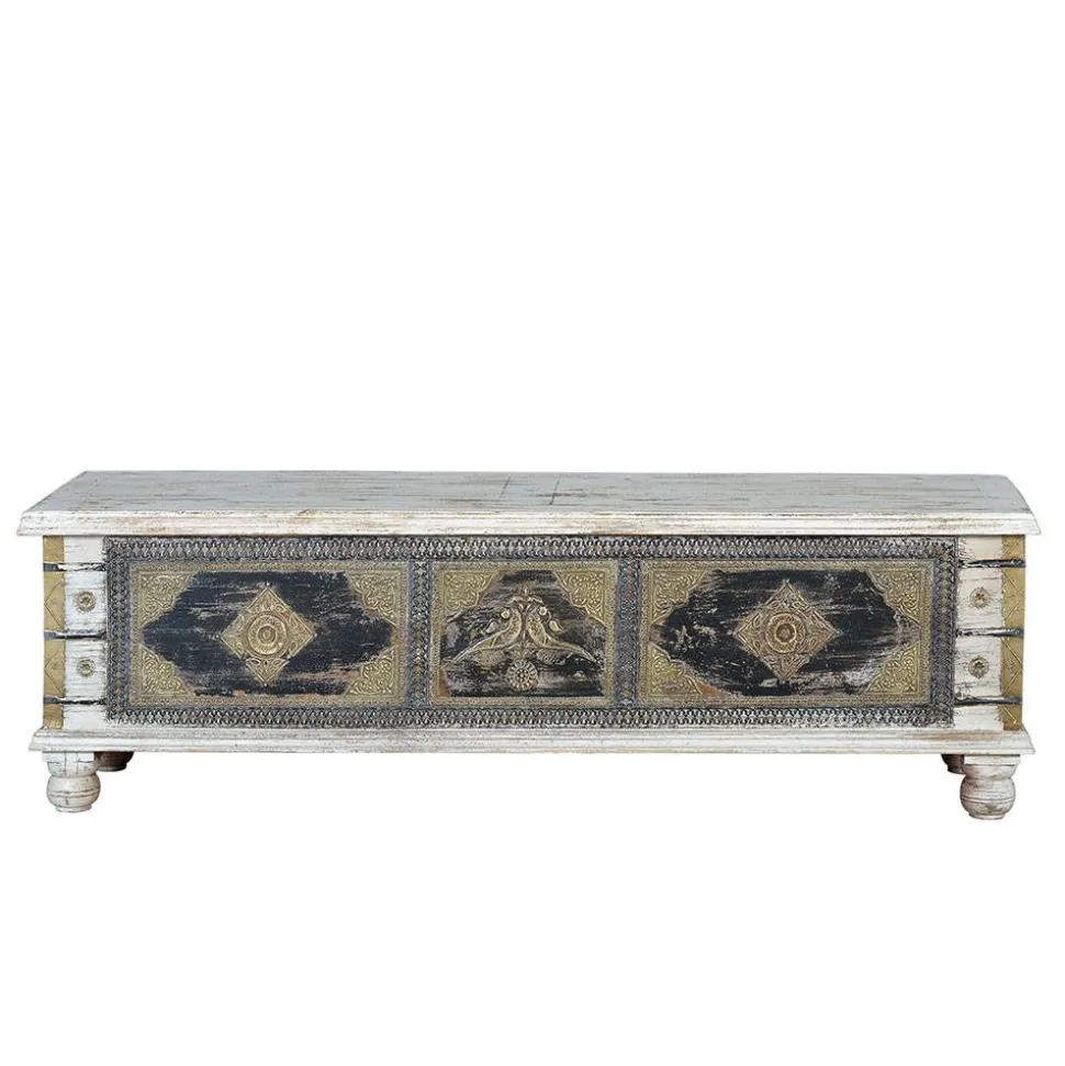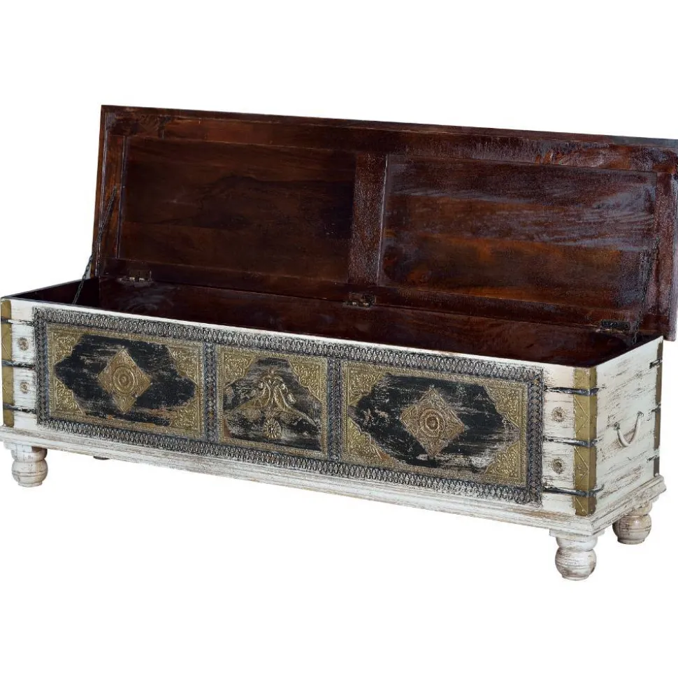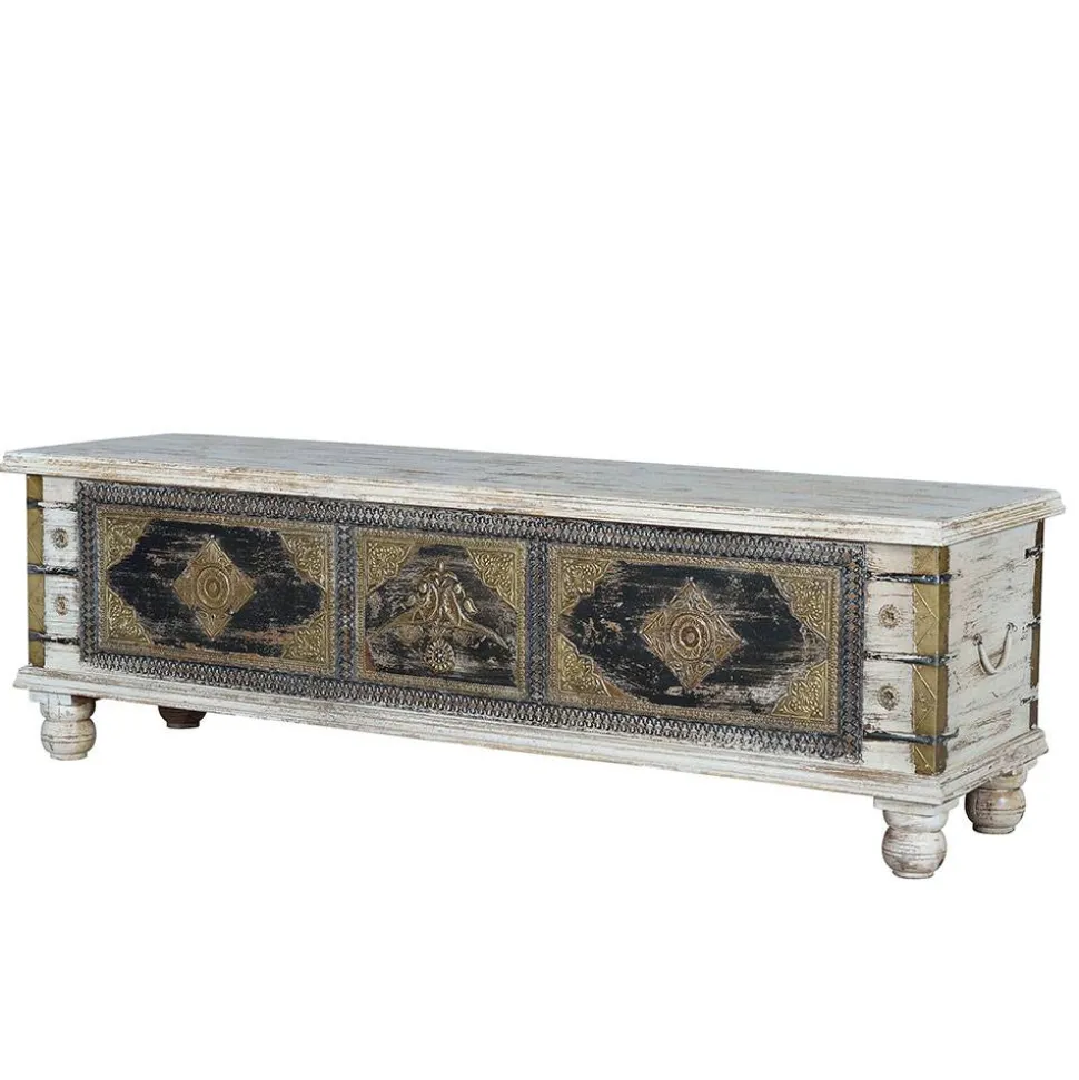 Gefertigt aus massivem Mangobaumholz, besticht die Truhe durch ihre robuste und langlebige Bauweise. Die Oberfläche ist handbemalt und mit Metall-Applikationen in Bronze veredelt, was ihr eine besondere, individuelle Note verleiht. Die Verwendung von Mangoholz sorgt für eine natürliche Ausstrahlung, die durch die präzise Handarbeit bei der Fertigung noch verstärkt wird. Die Truhe ist nicht nur ein funktionelles Möbelstück, sondern ein echtes Kunstwerk für Ihr Zuhause.
