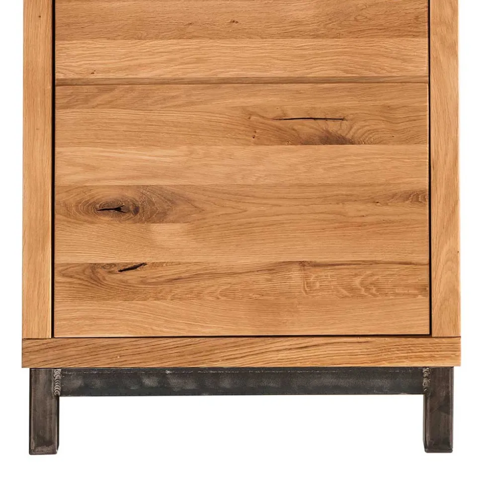 Entdecken Sie den stilvollen Garderobenschrank „Mulcian“ – ein zeitloses Designelement und praktischer Ordnungshelfer für Flur und Diele. Hergestellt aus massivem Wildeicheholz und Eisen, vereint dieser Schrank Strapazierfähigkeit mit Ästhetik.